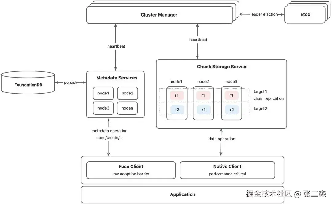 - Cluster Manager:集群中控,管理集群中的节点。其中Meta Service、Chunk Storage Service、Client均通过周期性租约机制维持在线状态,一旦这些节点状态有变化,由 Cluster Manager 负责通知到整个集群;并负责处理有状态节点的资源(比如关闭Client上的文件打开状态)。