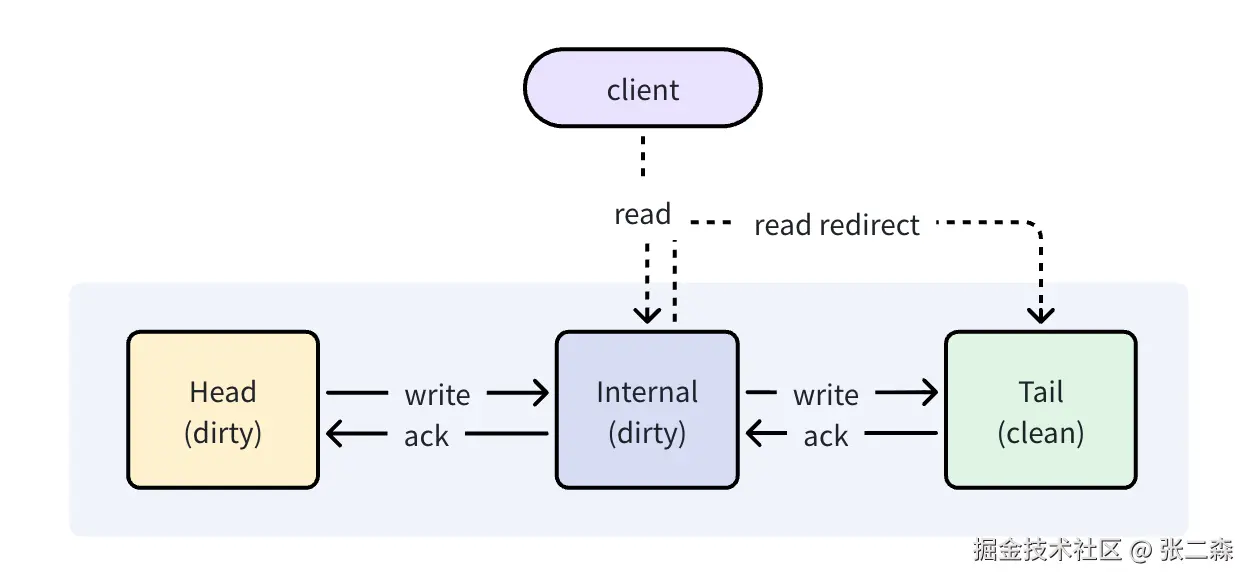 - 链式写入标记:写入请求顺序仍是Head -> Tail,不同的是Head->Tail的过程中,写入的数据会被标记为dirty。当Tail写入完成后,Tail的数据被标记为clean。此时执行Tail -> Head的反向传播,将刚刚提交的数据被标记为clean。