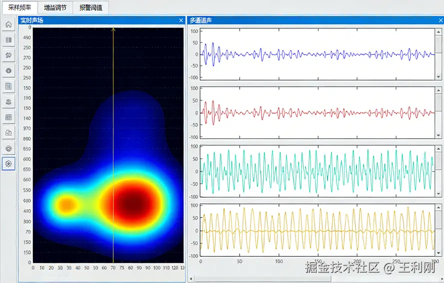- 声学成像模块:嵌入延迟求和波束形成算法,完成声源定位、声场强度计算与图像合成,通过 Alpha 透明算法实现声像叠加显示。