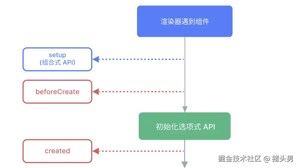 渲染器遇到组件→setup/beforeCreate→初始化选项式 API→created