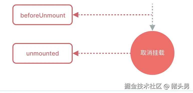 流程: 组件被取消挂载 → beforeUnmount → 取消挂载 → unmounted