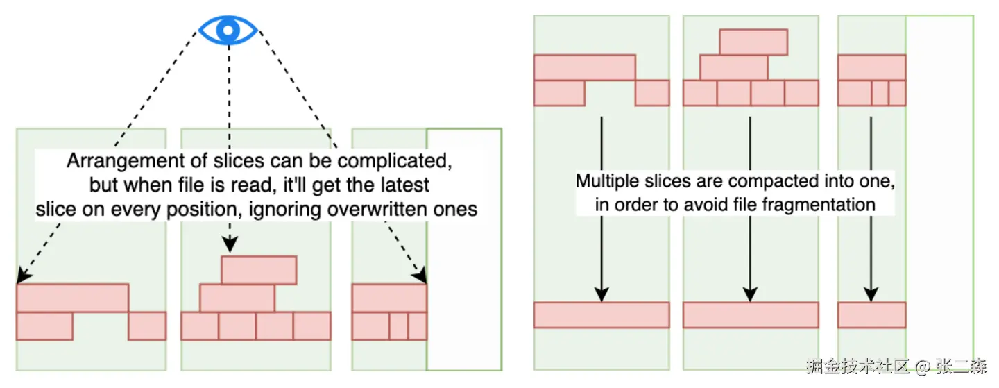 - 随机写:在原有文件的 Slice 上再写一层 Slice。注意这里并没有写时复制(Copy On Write),而是直接叠加写(如下左图)。随着随机写越来越多,一段数据的“Slice 版本”也就越来越多,这样会影响读取性能并增加空间占用。这里就需要进行 Compaction 整理,将多个 Slice 数据版本进行合并(如下右图)