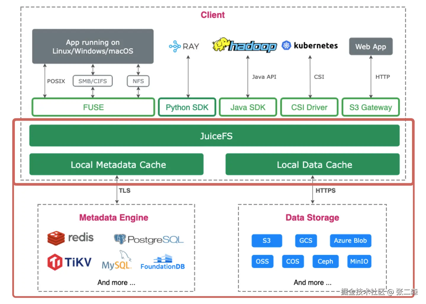 JuiceFS 如图中的红框的模块所示,主要由三个部分构成: