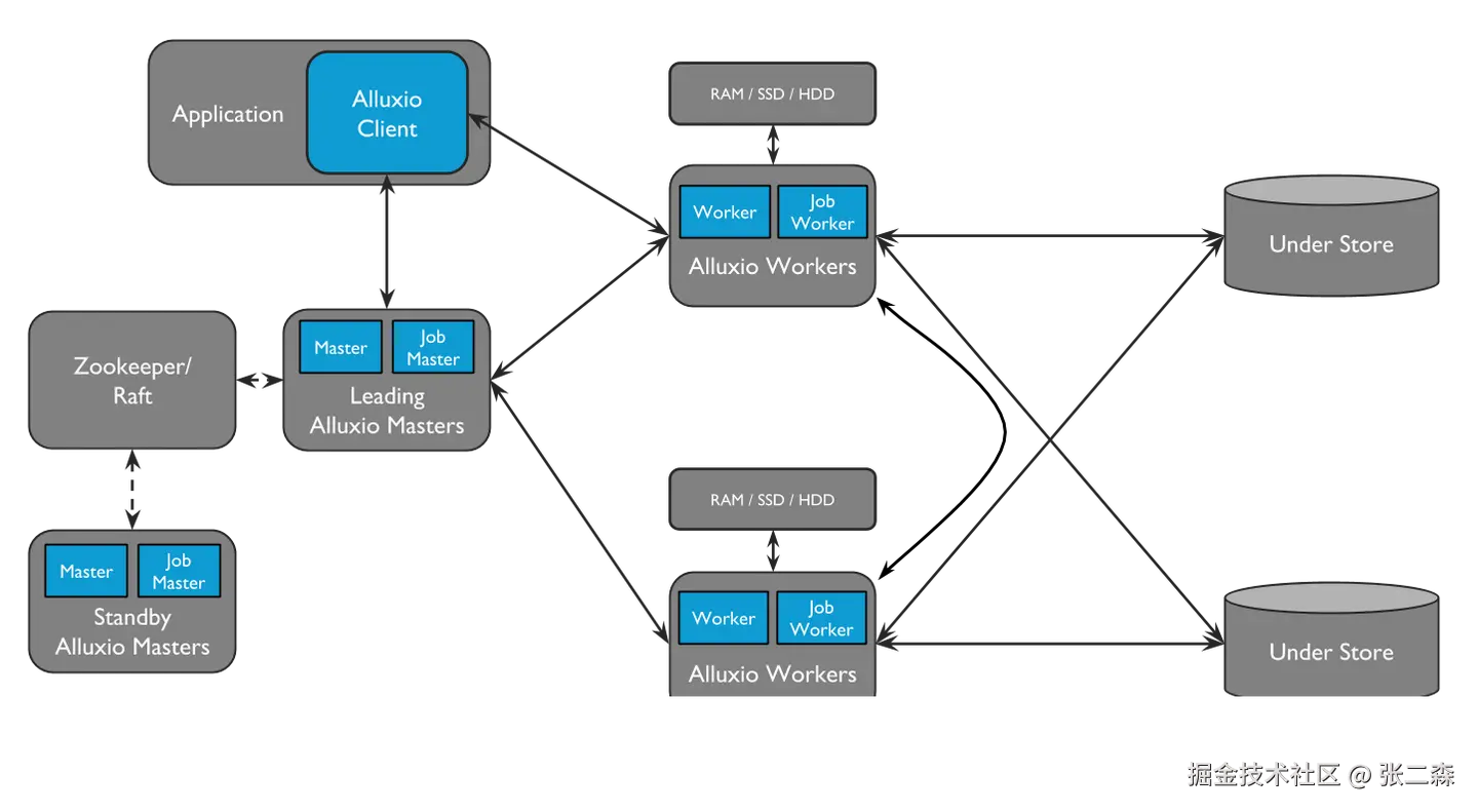 通常 Alluxio 会和计算/训练节点部署在同一个集群上,作为一个伴生服务(如图中的 Application)。Alluxio 是主从架构,有两种角色: