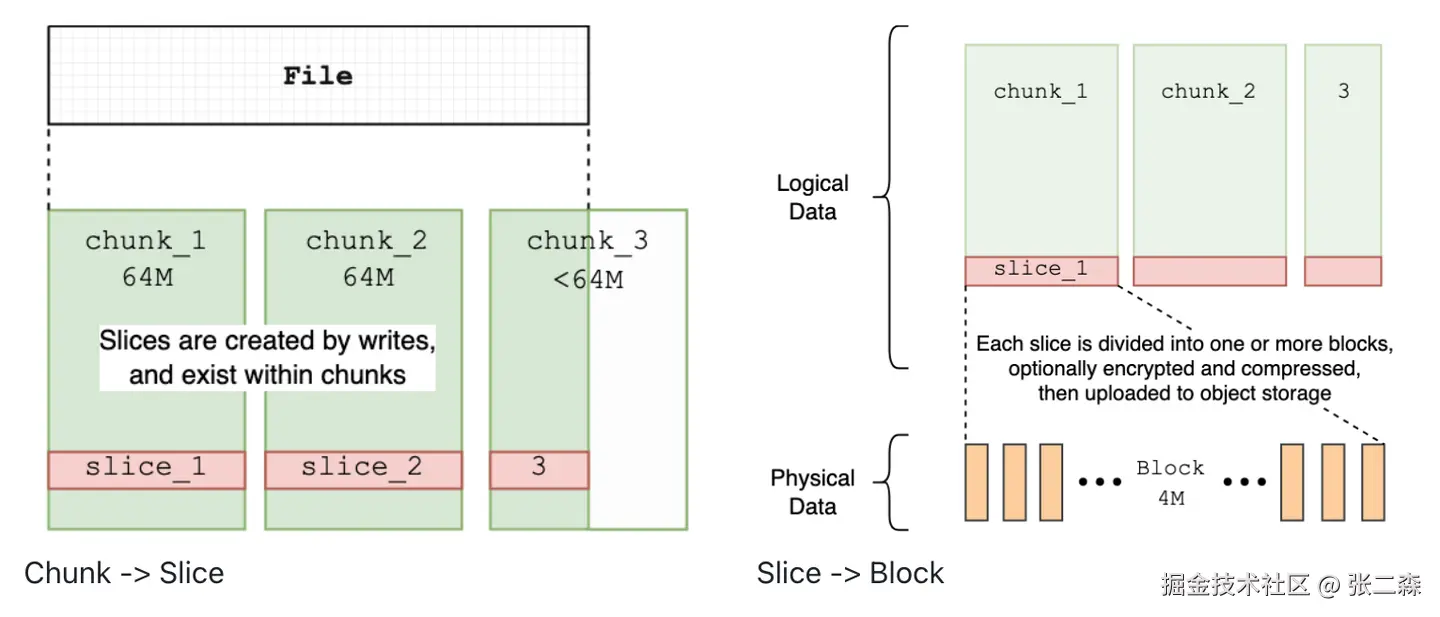 - Slice:逻辑概念;代表一次连续的写,类似于一段数据的一个版本。一个 Chunk 只包含一个 Slice,Slice 不会跨 Chunk。通过 Slice 就可以实现随机写,下文详述。