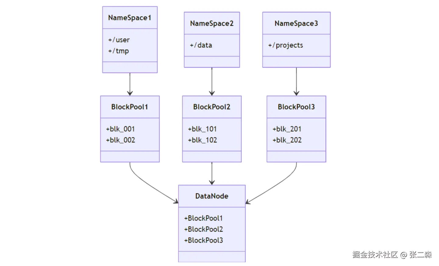 类比到 Namenode 这里,其实原先是一个 Active NameNode,现在就是一组 Active NameNode。HDFS 将原先一个大的 namespace 下的元数据拆分成多个 namespace,每个 Namenode 来负责存储一个 namespace 的元数据,但这组 Namenode 没有一个主节点。