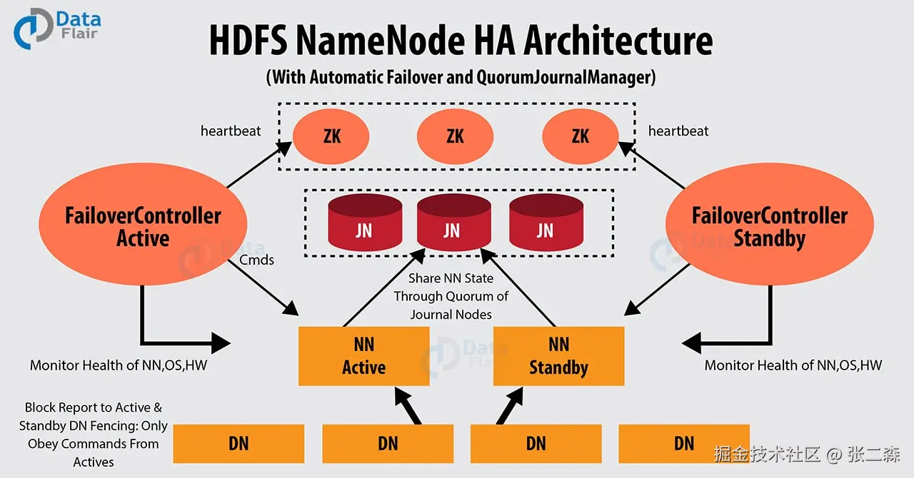 HDFS 采用了一组 JournalNodes(下图深红色块,后续简称为 JNs;Journal 在英语中有“日记”的意思)来记录 NameNode 的 WAL 日志(Write Ahead Log),这个 WAL 日志在 HDFS 被称作 EditLog。
