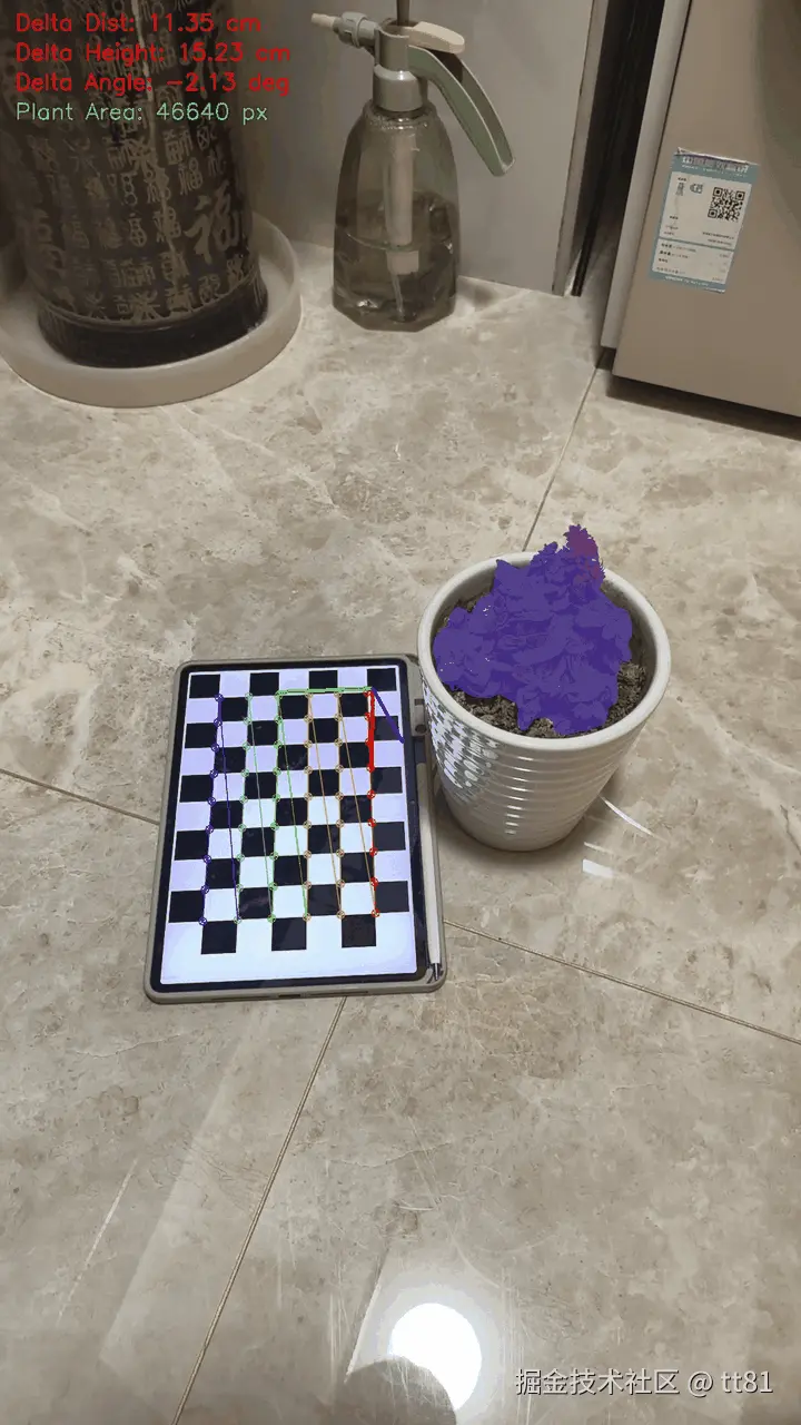 笔者最近尝试使用单目相机检测和deeplabv3的语义分割模型对帐篷内盆栽植物生长的速度进行检测,主要粗略测量植物整体的面积投影,但是经过长时间的测量发现,由于植物叶片面积的生长速度应以星期计算,在此期间,任何对相机造成抖动、位移变化都会造成显著的透视失真,所以就产生了本项目,运用张正友标定法和PnP算法,以一种低成本的方法去缓解相机抖动产生的透视失真;