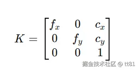 其中 fx,fy 为焦距(像素单位),cx,cy 为主点坐标。