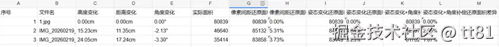 - 面积补偿:基于位姿变化计算补偿因子,将当前视角的植物像素面积还原为参考视角下的近似物理面积。