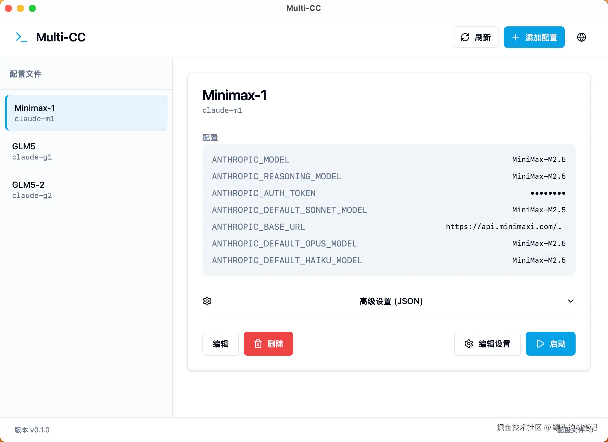 想用哪个厂商,点对应 Profile 旁边的「启动」按钮,直接弹出一个新终端窗口,Claude Code 实例就跑起来了,带着你配置好的 API。不用手动改环境变量,不用重启。