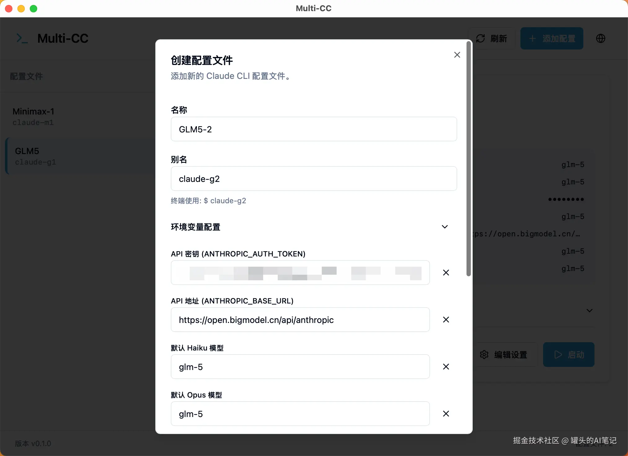 打开 Multi-CC,新建 Profile,填入厂商的 API Key 和 Base URL,起个名字,比如「GLM」「MiniMax」「备用代理」。一个厂商一个 Profile,一次配置,永久复用。