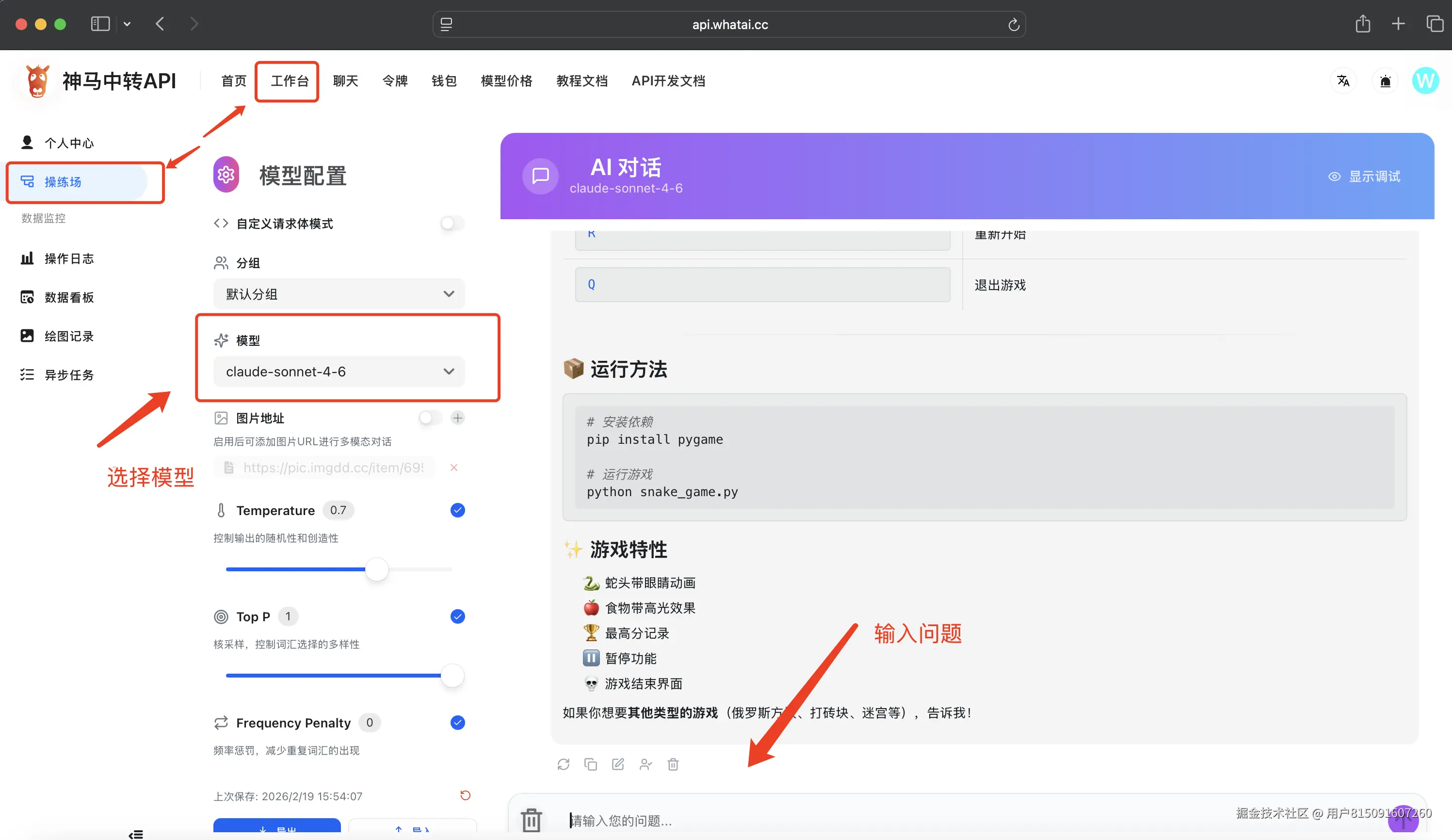 首页-工作台-操练场选择模型claude-sonnet-4-6,输入问题测试使用