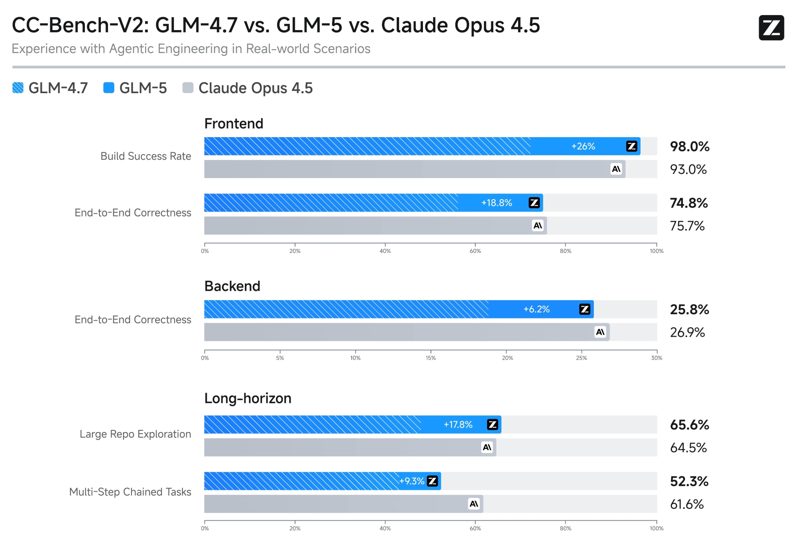 在内部 Claude Code 评估集合中,GLM-5 在前端、后端、长程任务等编程开发任务上显著超越 GLM-4.7,能够以极少的人工干预自主完成 Agentic 长程规划与执行、后端重构和深度调试等系统工程任务。