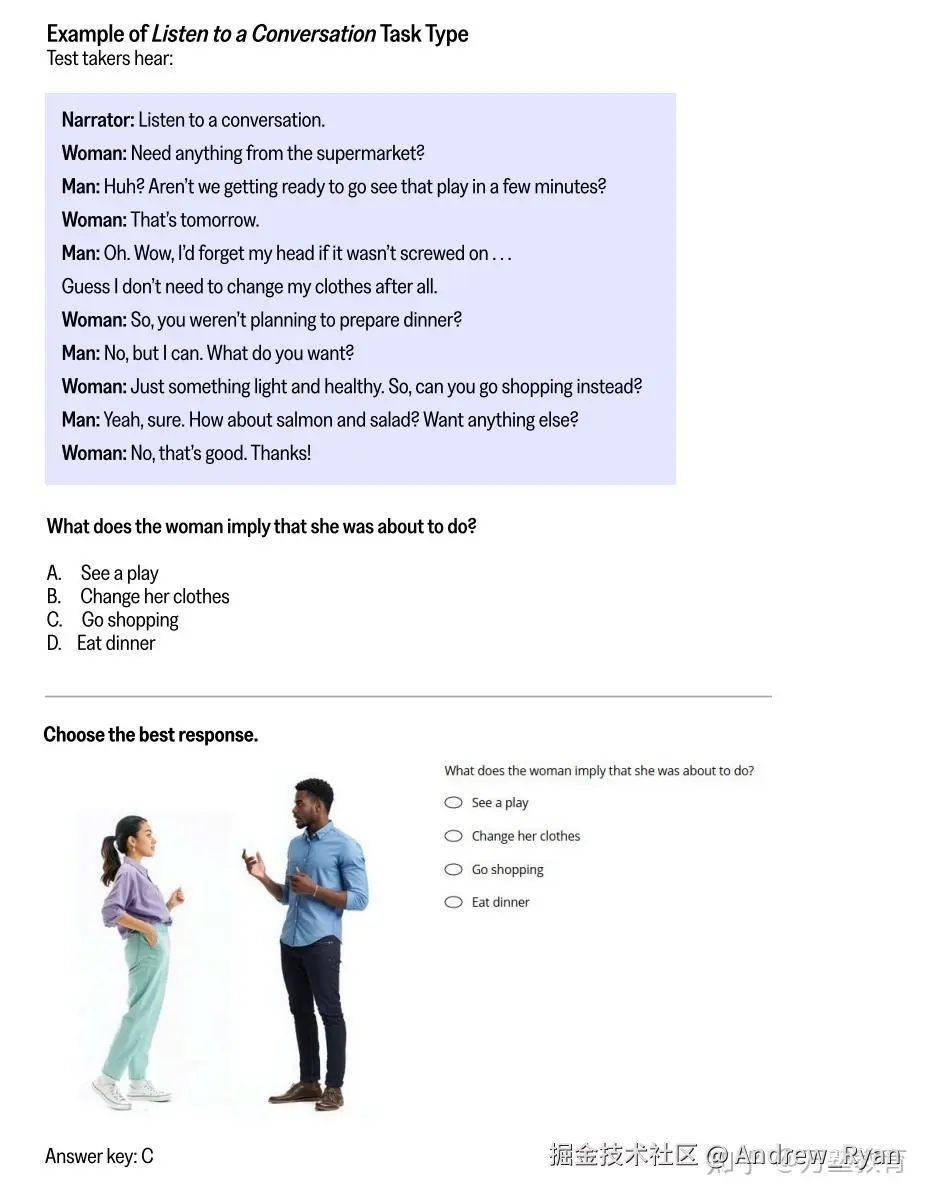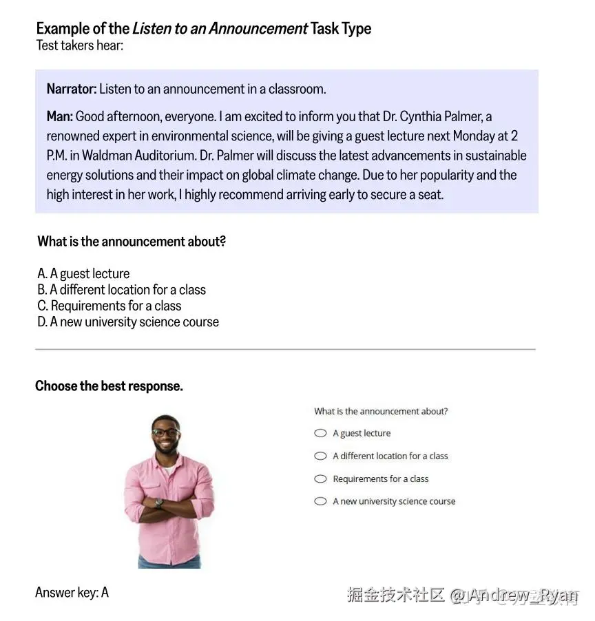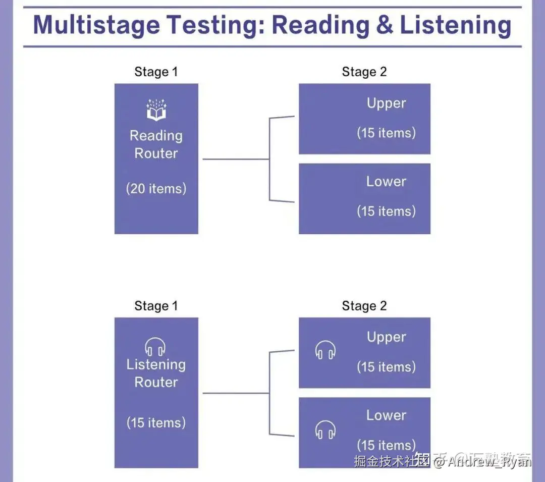 1)Stage1(15题):混合日常与学术听力,正确率决定Stage2难度。