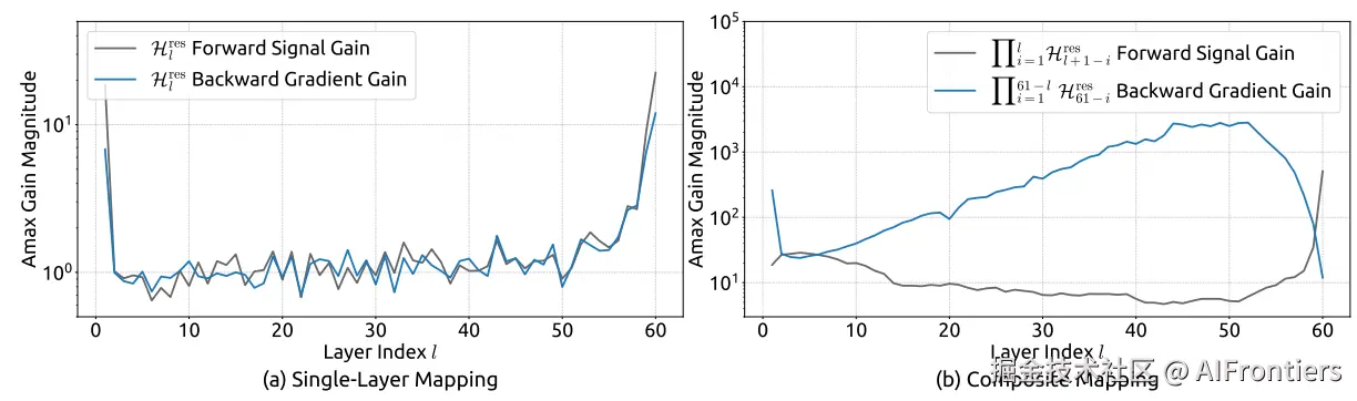 另外,由于 矩阵是无约束的,可以往任意方向发散。论文测量了一个叫「Amax Gain Magnitude」的指标,在残差流里被放大了3000倍。在大规模训练中,这就是爆炸的前奏。