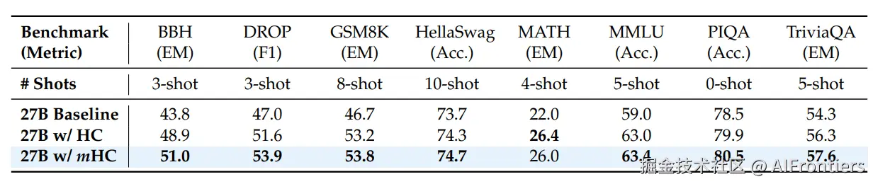 表 4展示了模型在多种下游基准测试中的性能表现。相比于基线模型,mHC实现了全面的性能提升,并在大多数任务上超过了HC。值得注意的是,与HC相比,mHC 进一步增强了模型的推理能力,在 BBH上实现了2.1%的性能提升,在 DROP上实现了2.3%的性能提升。