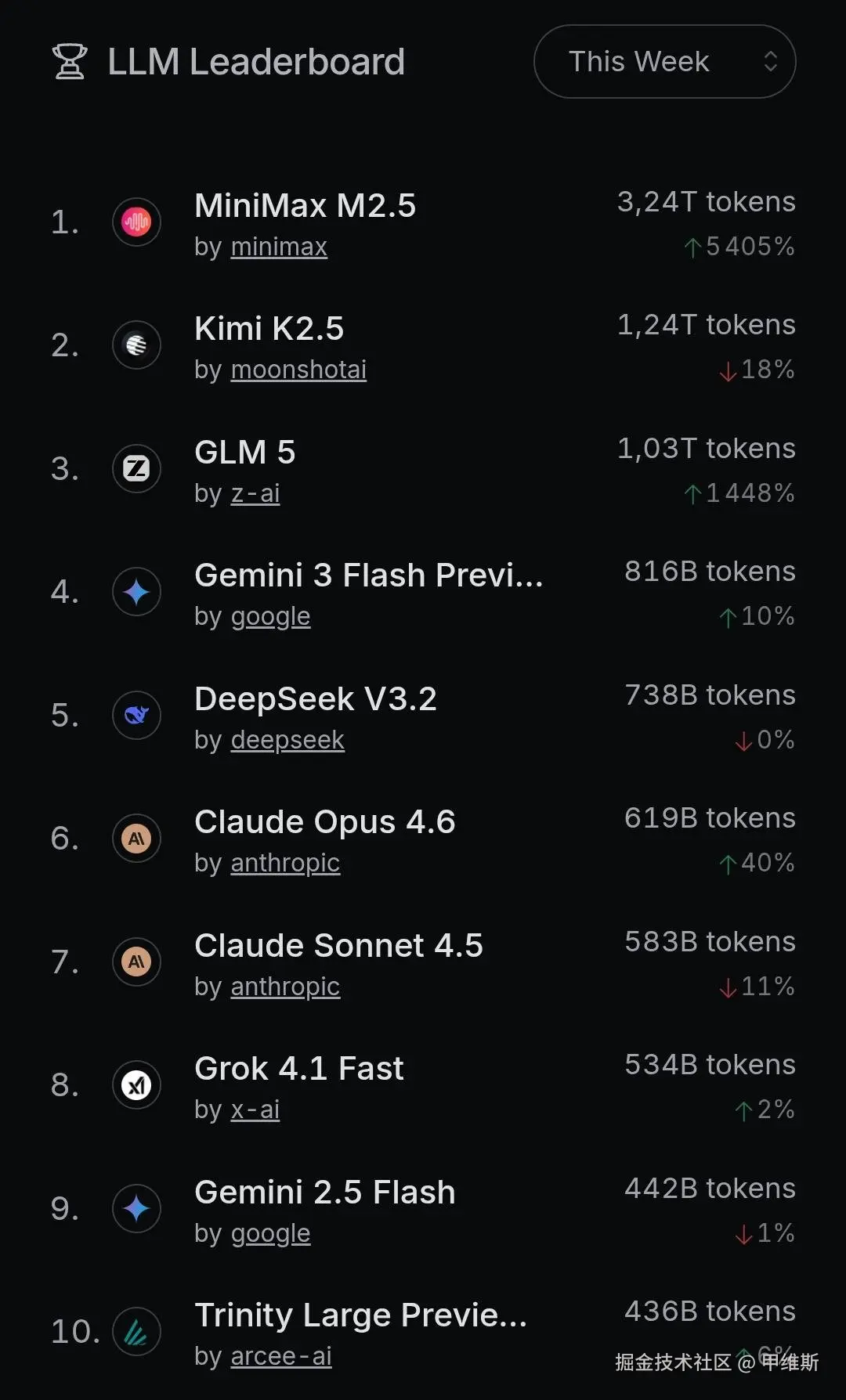 在大模型 API 调用平台上,MiniMax 凭借一周 3T 的 token 使用量,拿下了第一名。这个榜单中前三名全部是中国公司,分别是 MiniMax、Kimi、GLM。既然如此,我们应该认真对待一下国产 AI 模型了。