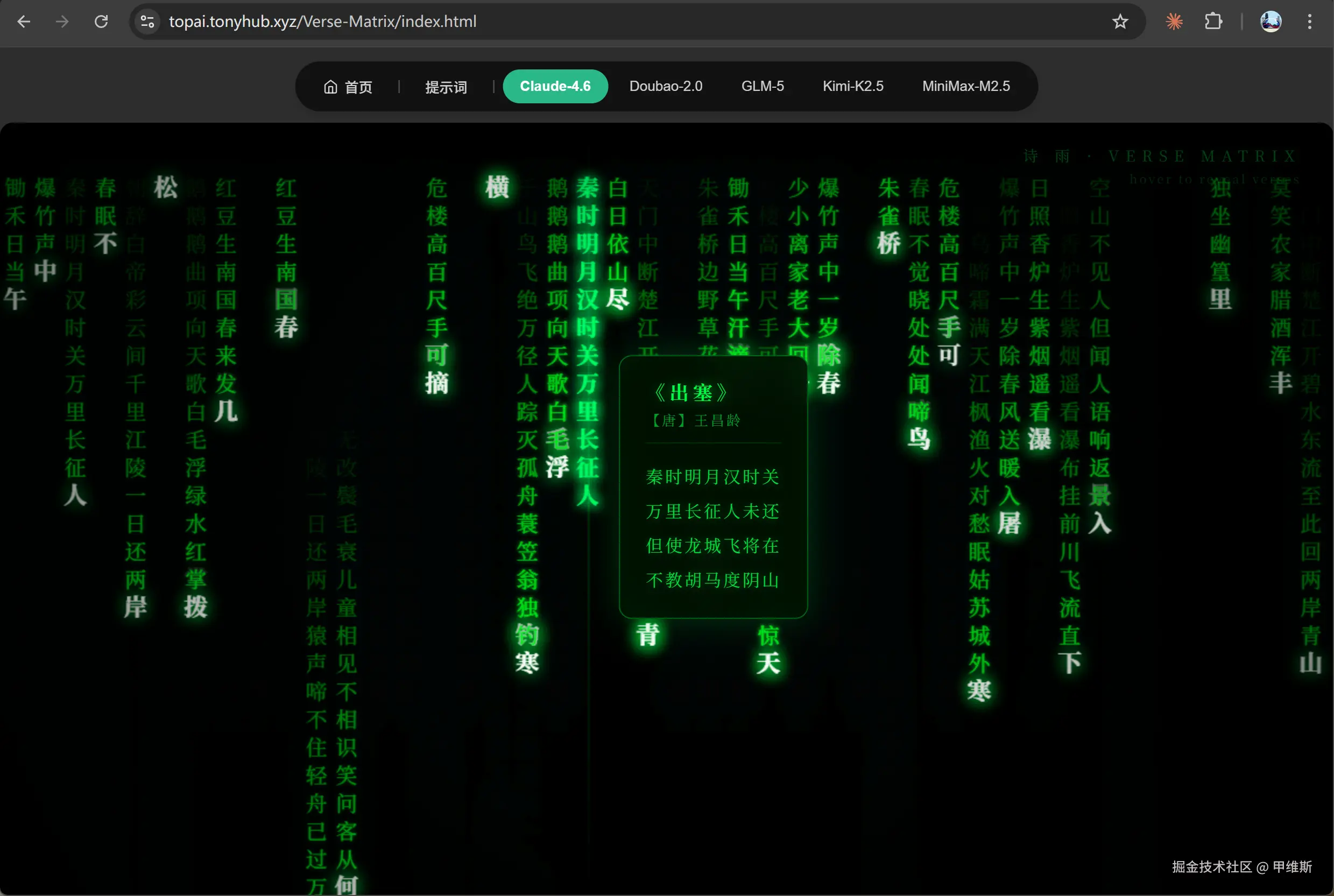- 当鼠标划过某一列时,该列暂停并高亮显示完整诗句,旁边浮现诗人名和朝代