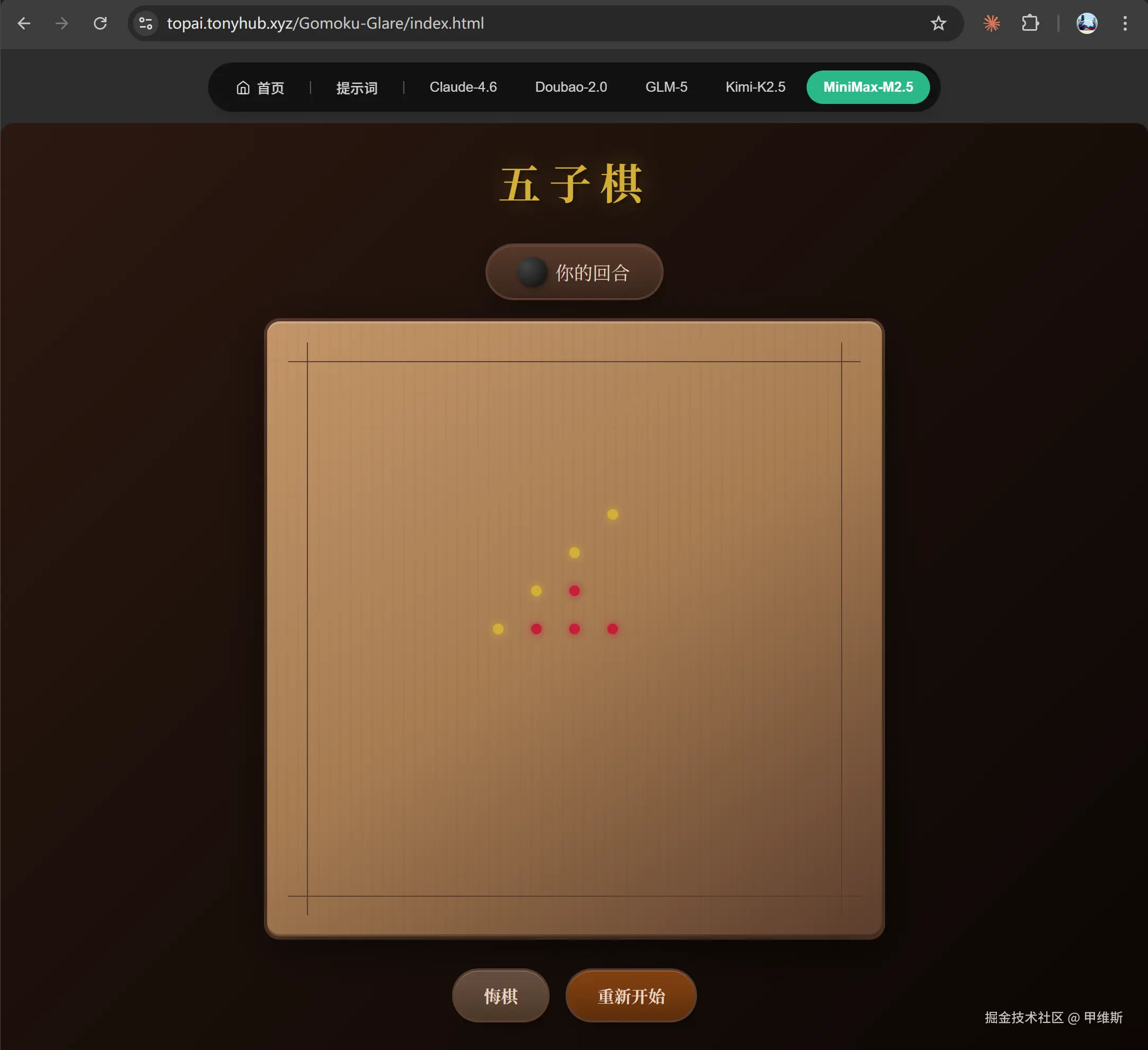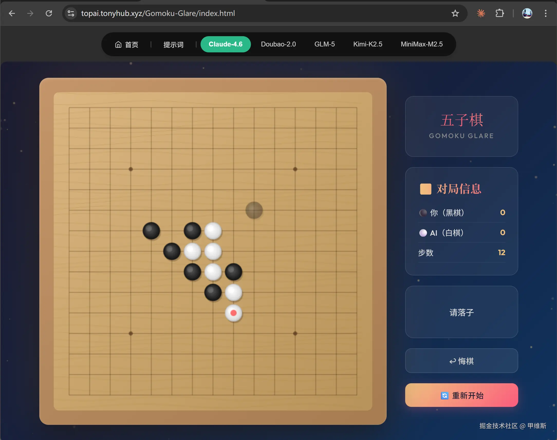 整体来说,两个模型都把功能给做出了,界面设计上也不分伯仲。我比较喜欢 Claude 的棋盘,和 MiniMax 的按钮。对战逻辑上也都没有大问题。