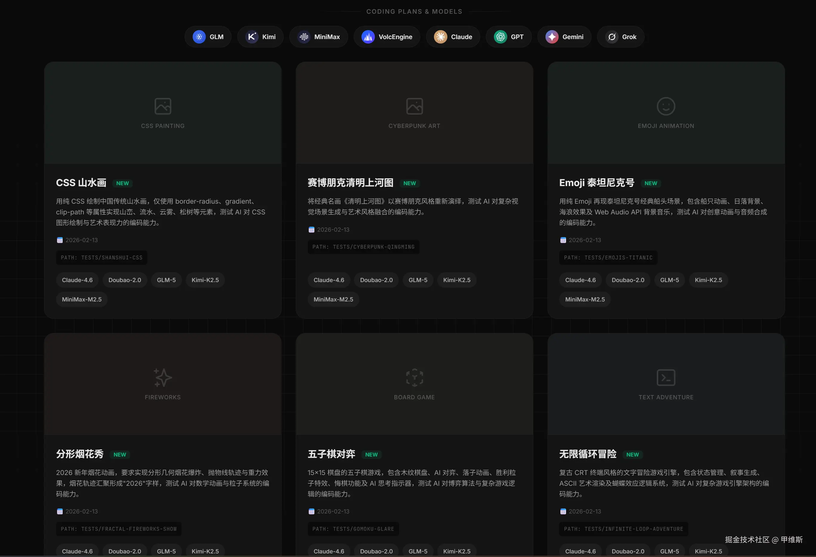 这要求模型具备极强的 SVG/Canvas 绘图编程能力、CSS 动画逻辑以及审美设计能力。普通人只需打开网页就能直观判断谁做得更精美、更流畅。