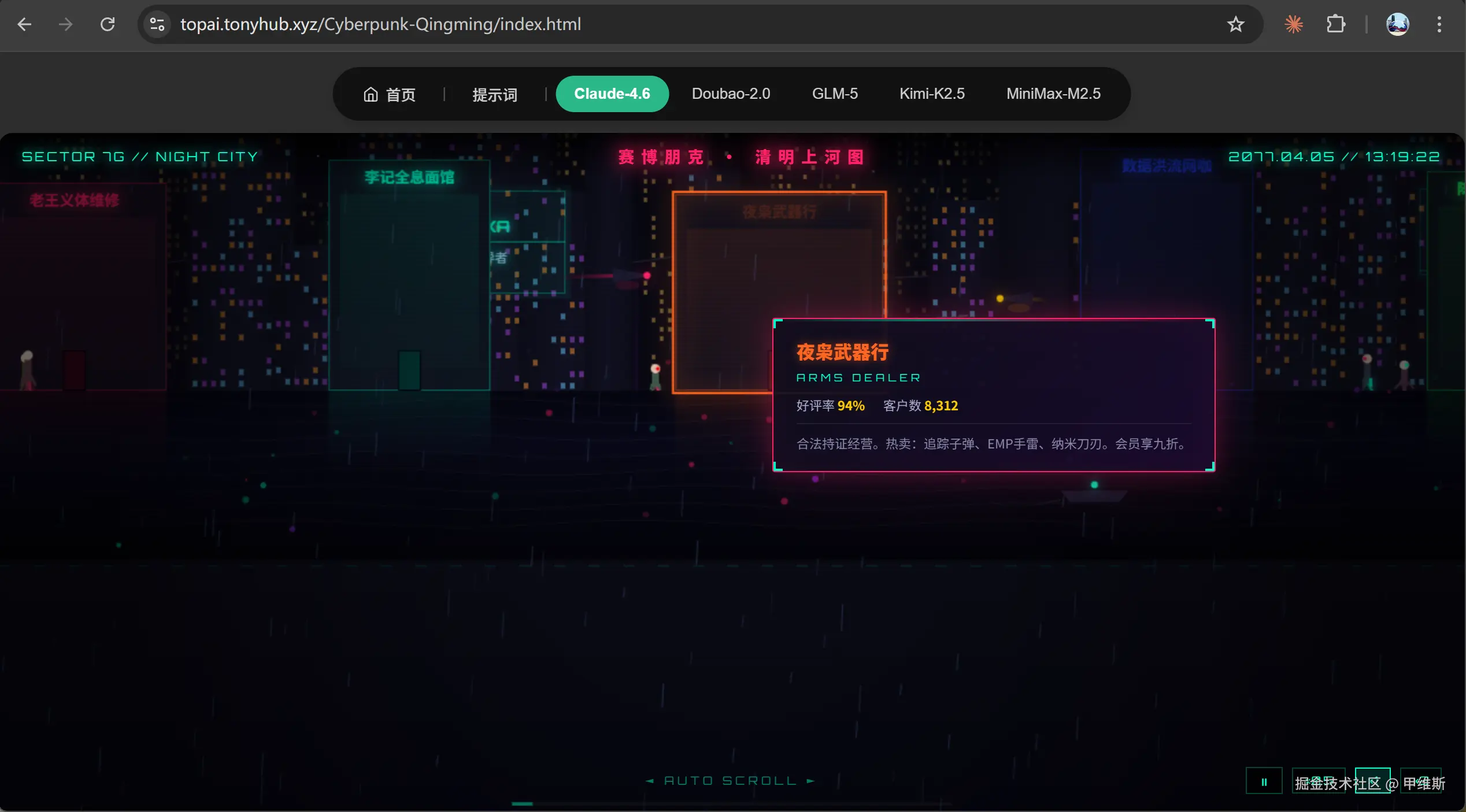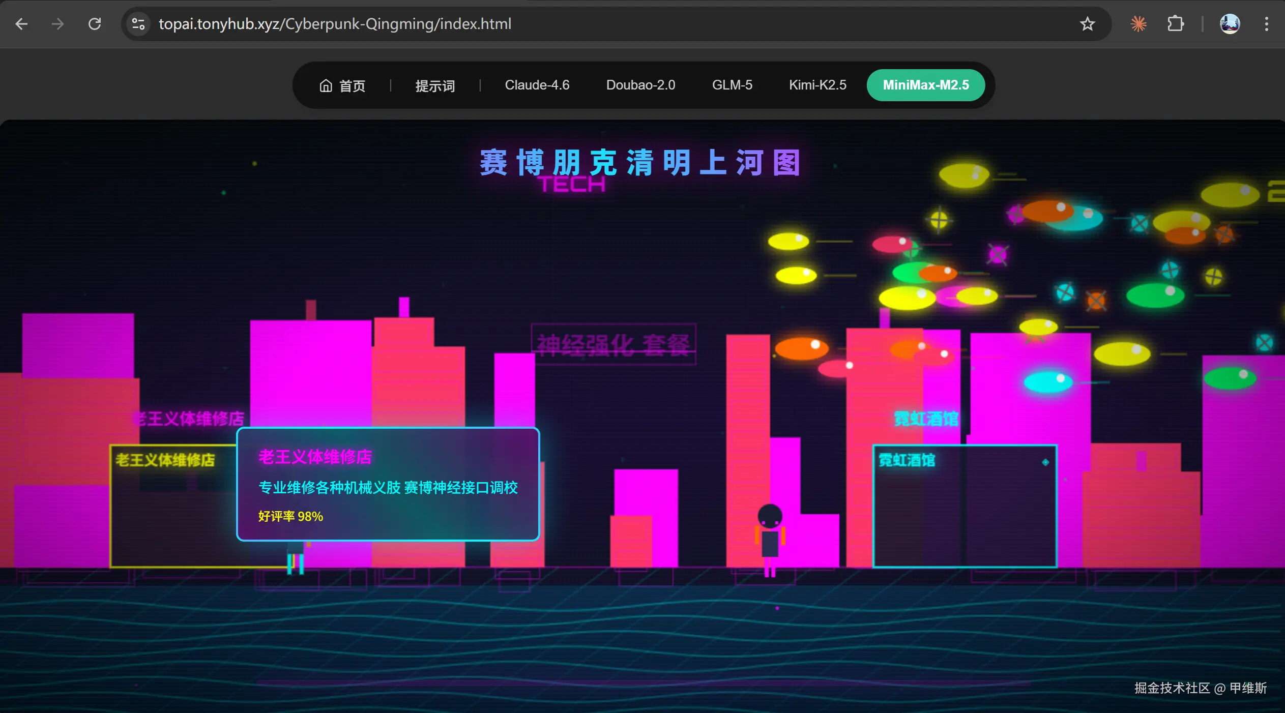 3. 鼠标悬停在任意店铺上时,要弹出一个赛博风格的信息卡片(如“老王义体维修店 - 好评率 98%”)。