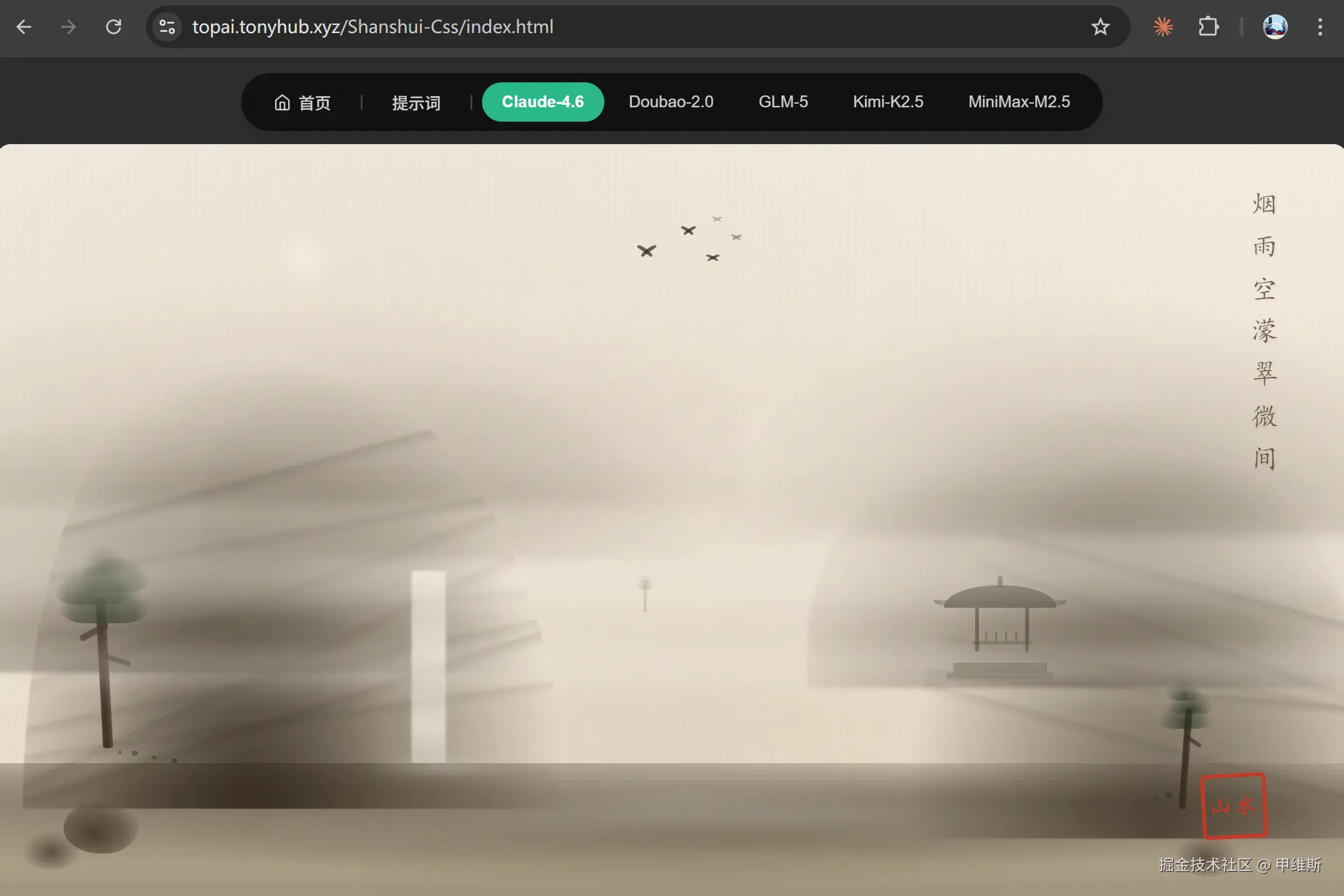Claude 4.6 的中国画朦胧意境非常不错,还配了诗词和印章,用了大量的圆弧和曲线,看起来非常柔和。