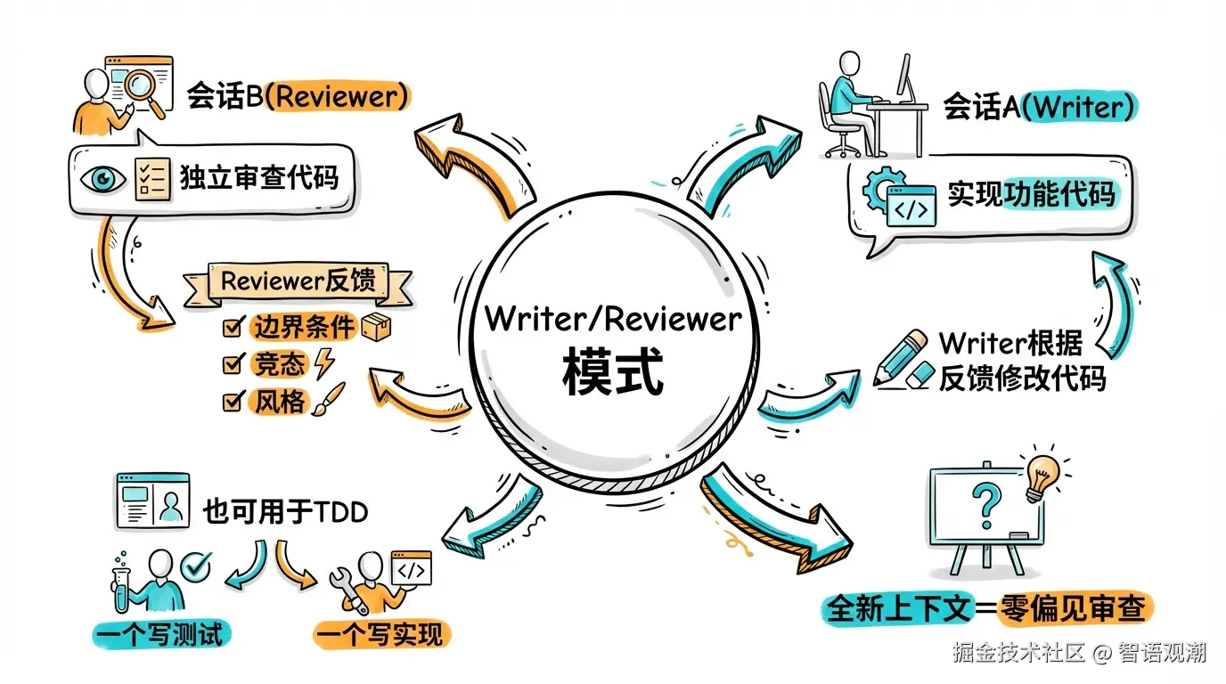 Claude Code 官方推荐的一个高级玩法是 Writer/Reviewer 模式: