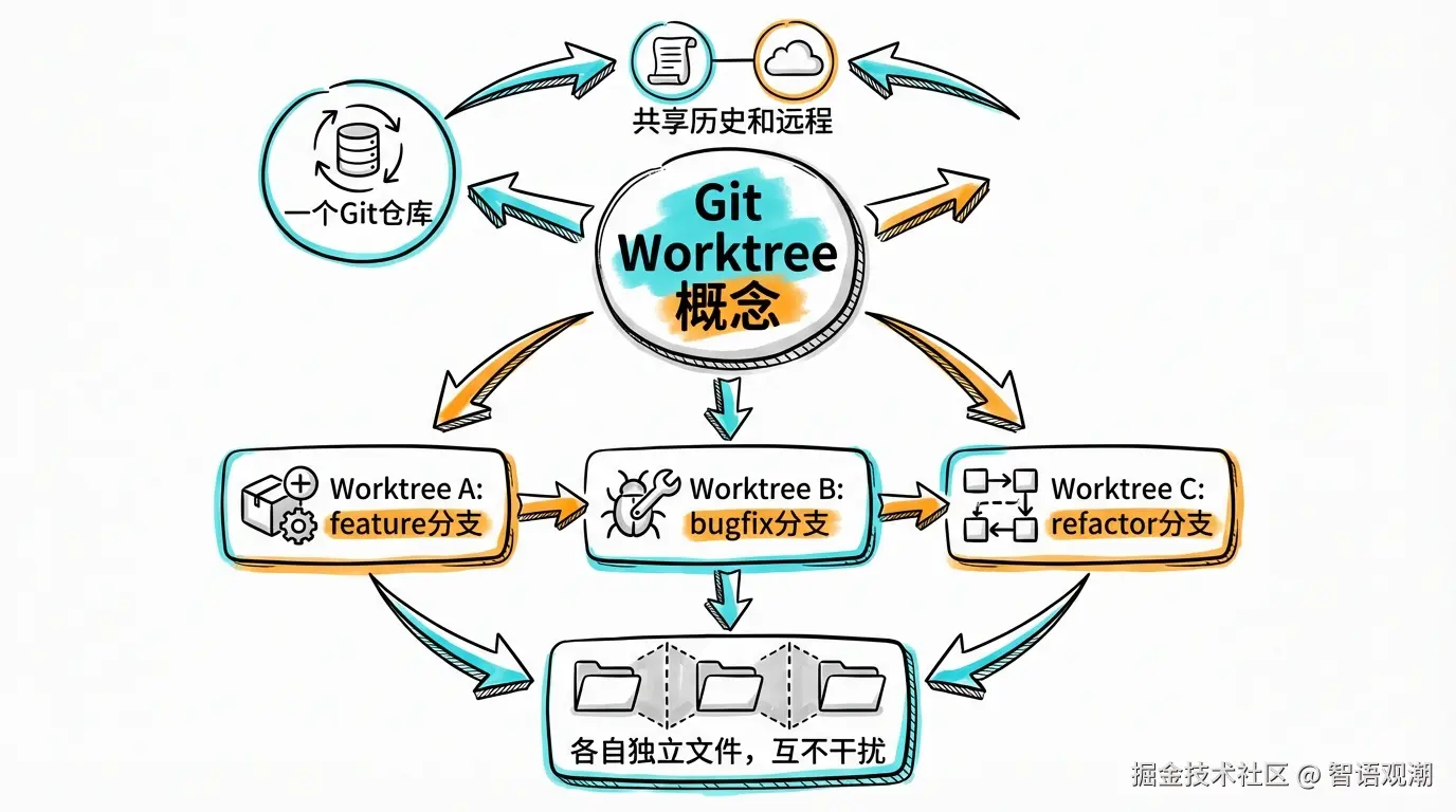 简单来说,Git Worktree 让你从一个仓库里"克隆"出多个工作目录。每个目录有自己的文件和分支,但它们共享同一份 Git 历史和远程连接。