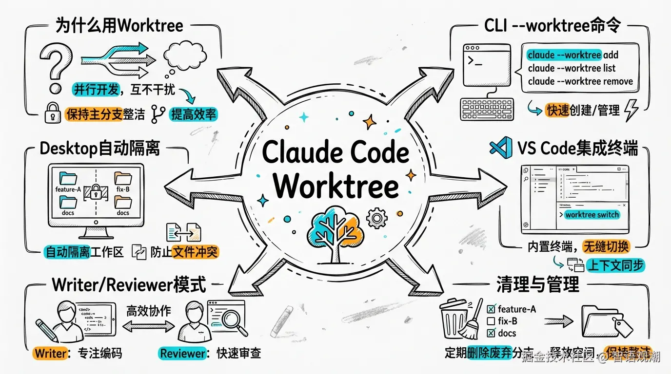 Git Worktree 是 Claude Code 中实现并行开发的核心能力。无论你用 CLI、Desktop 还是 VS Code,都能通过 Worktree 让多个 Claude 会话同时干活,互不干扰。
