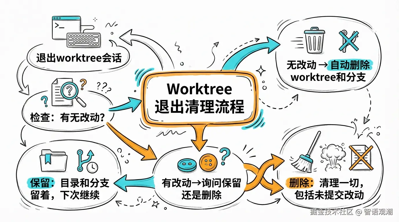 - 没有任何改动:Claude 自动删除 worktree 和对应分支,不留垃圾
