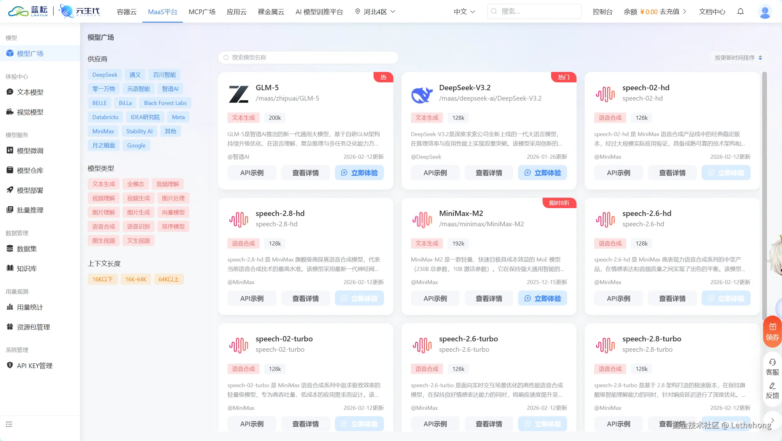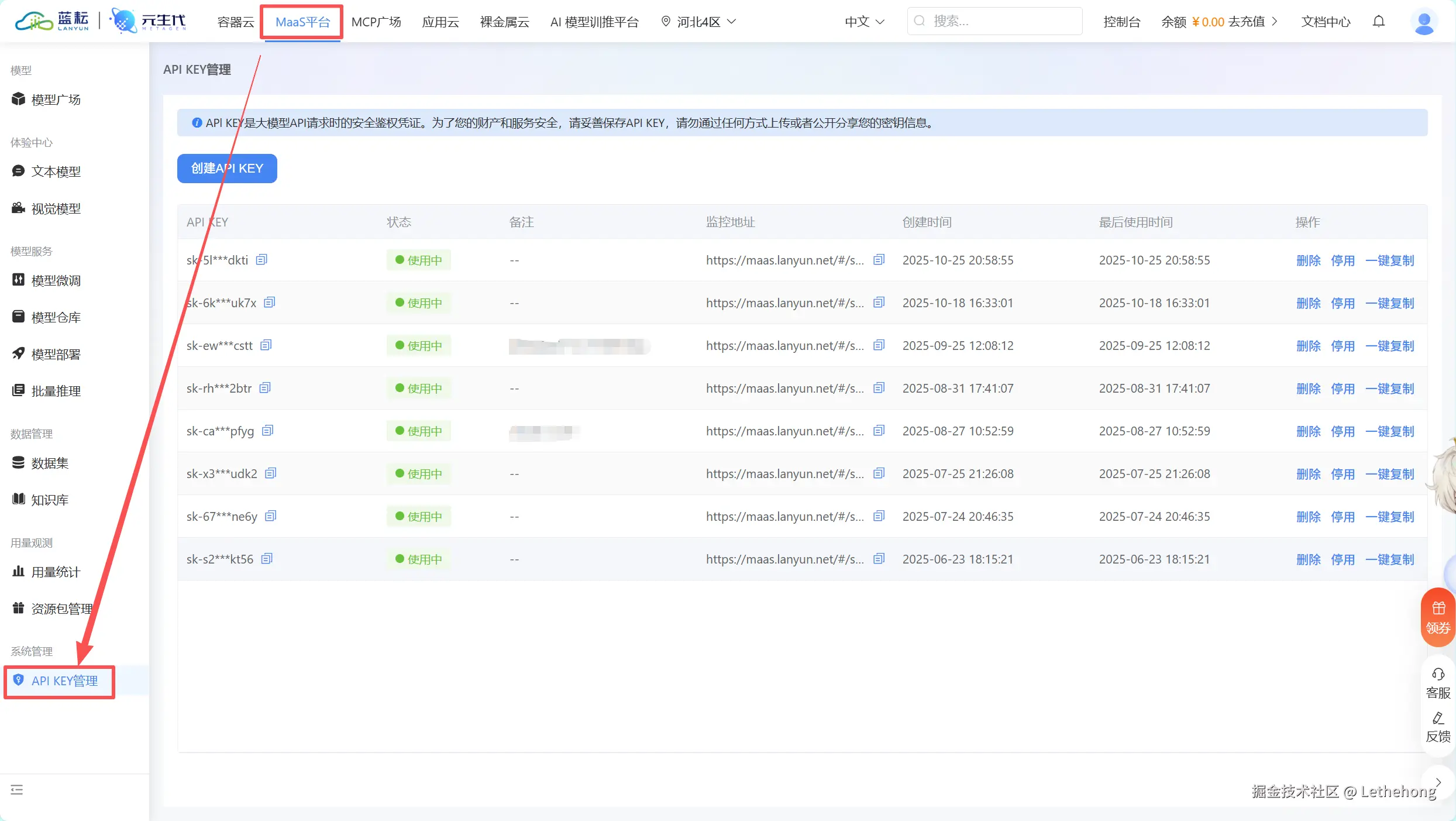 要使用GLM-5,首先需在蓝耘元生代智算云平台完成注册。注册成功后,进入控制台,点击“MaaS平台”选项,即可看到“创建API KEY”的按钮。点击生成专属的API Key,该密钥将作为调用平台接口的凭证。平台支持Python、Java、JavaScript等主流编程语言,开发者可根据自身技术栈灵活选择调用方式。