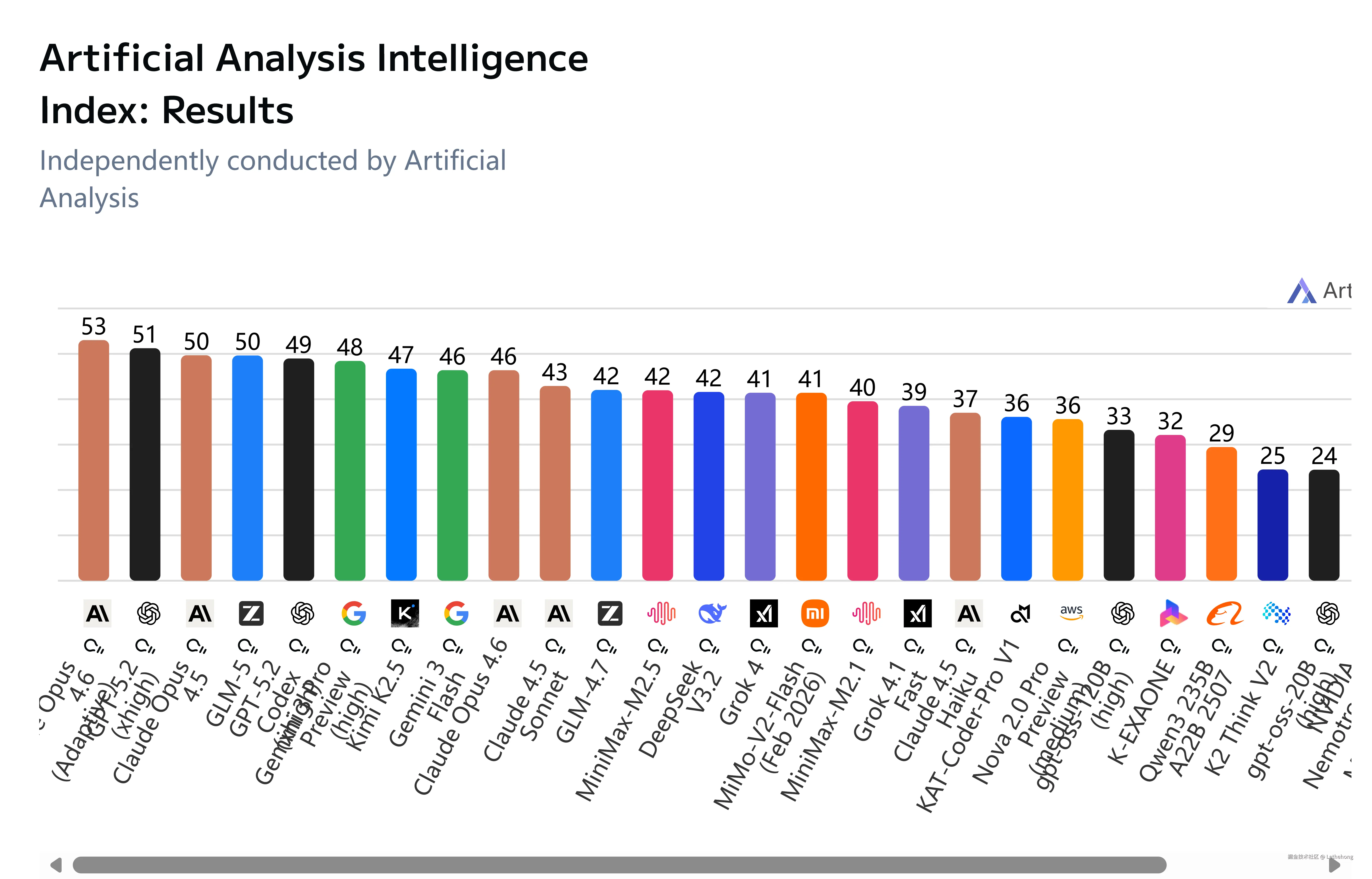 在国际权威评测机构Artificial Analysis发布的Intelligence Index v4.0榜单中,GLM-5以50分的综合成绩位列全球第四,成为开源模型第一。该榜单整合了10项权威评测,涵盖了知识问答、数学推理、代码生成等多个维度。GLM-5的这一成绩打破了开源与闭源模型的壁垒,证明了其在通用智能能力上已逼近国际顶尖水平。