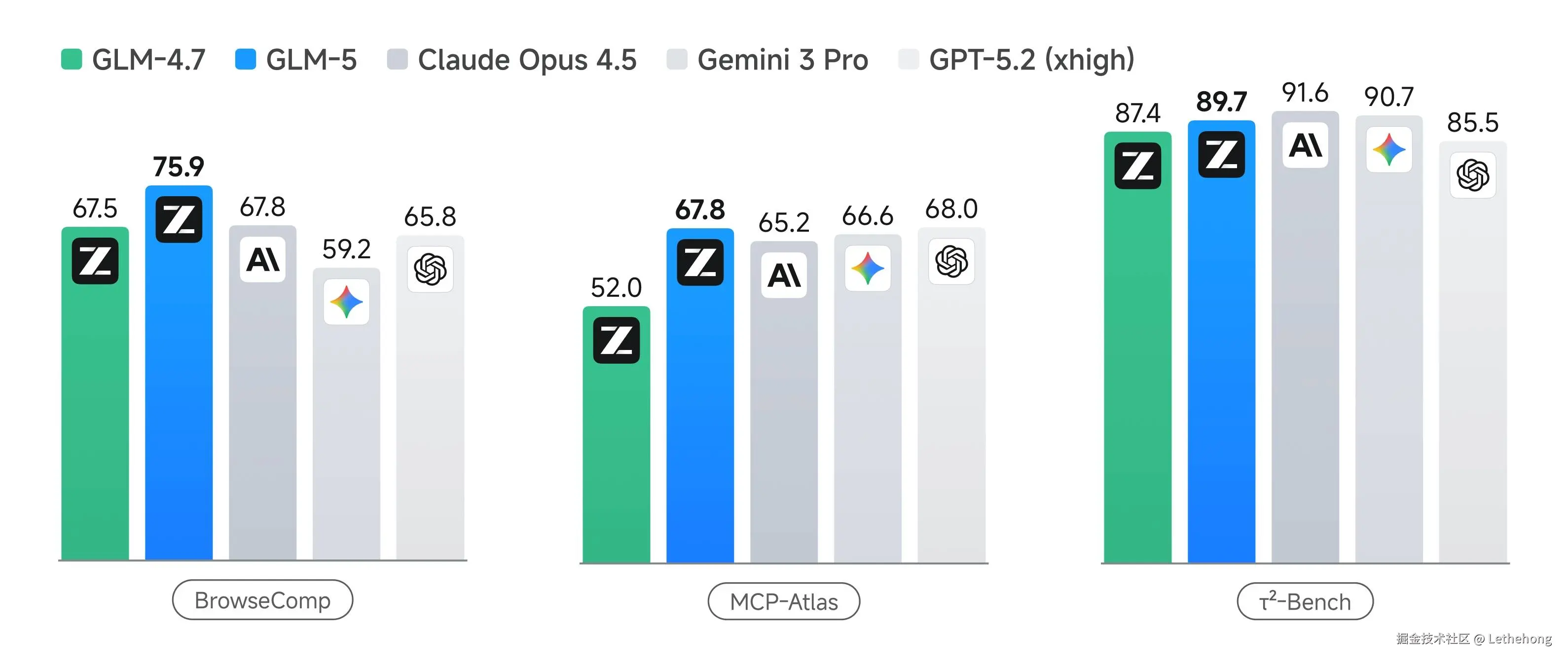 在Agent能力评测方面,GLM-5表现尤为突出。在GDPval-AA(Agentic Real-World Work Tasks)测试中,GLM-5的Elo评分达到1409分,全球第四、开源第一。在BrowseComp(联网检索与信息理解)、MCP-Atlas(大规模端到端工具调用)和τ²-Bench(复杂场景下自动代理工具规划与执行)三项权威评测中,GLM-5均取得开源模型最优表现。这些评测结果印证了GLM-5在长程任务规划、多工具协同执行等方面的卓越能力。