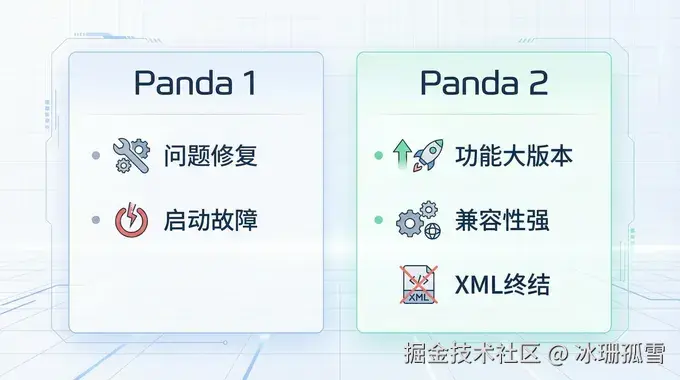 简单总结: Panda 1 是想把旧房子修修补补,结果把门堵死了;Panda 2 直接盖了栋新房,虽然还在装修,但至少门敞开着。