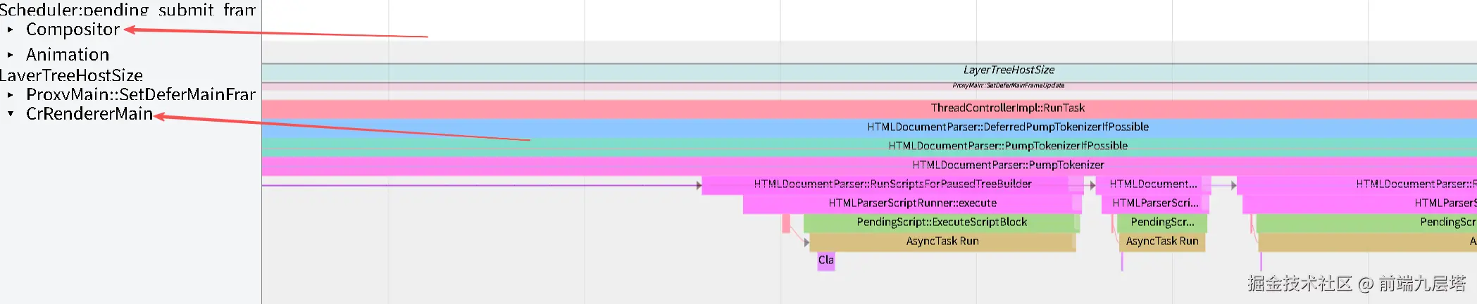 - CrRendererMain(渲染主线程) 主要是生成layerTree,Compositor(合成线程) 负责对layerTree进行合成 ,CrGpuMain负责执行光栅化和合成 。
