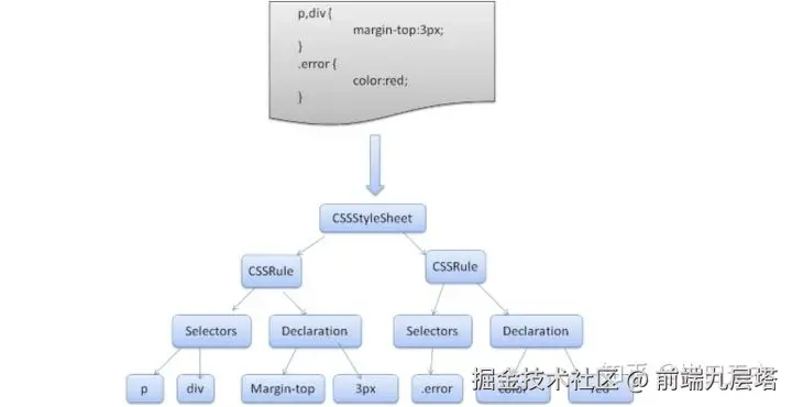 每个<style>或<link>样式会转换成一个CSSStyleSheet 对象:由若干个Rule组成,每个 Rule 包含 Selector和Declearation{Property:Value}。至于内联样式,在构建 DOM 树时会直接解析成 Declearation 集合。