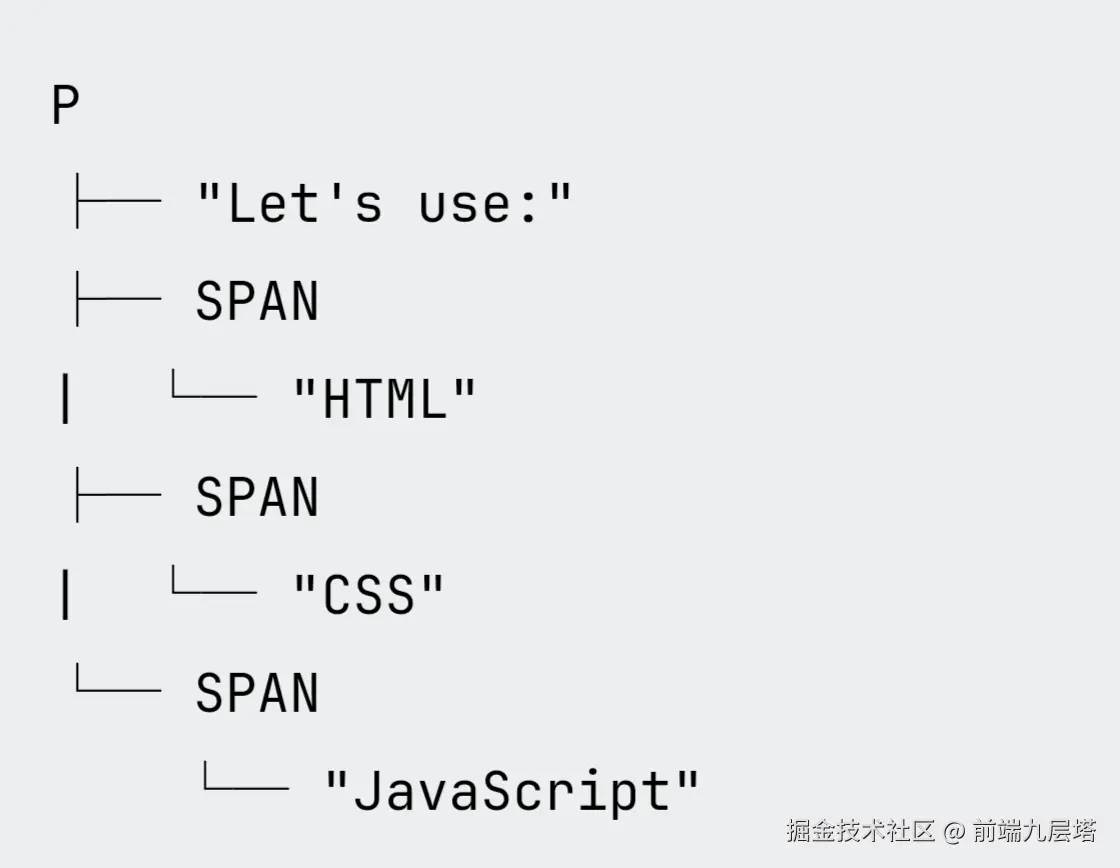 DOM树描述了文档结构信息。p元素是一个父节点,它的子节点包括一个文本节点以及三个span元素。这些span元素同时也是父节点,其子节点是文本。