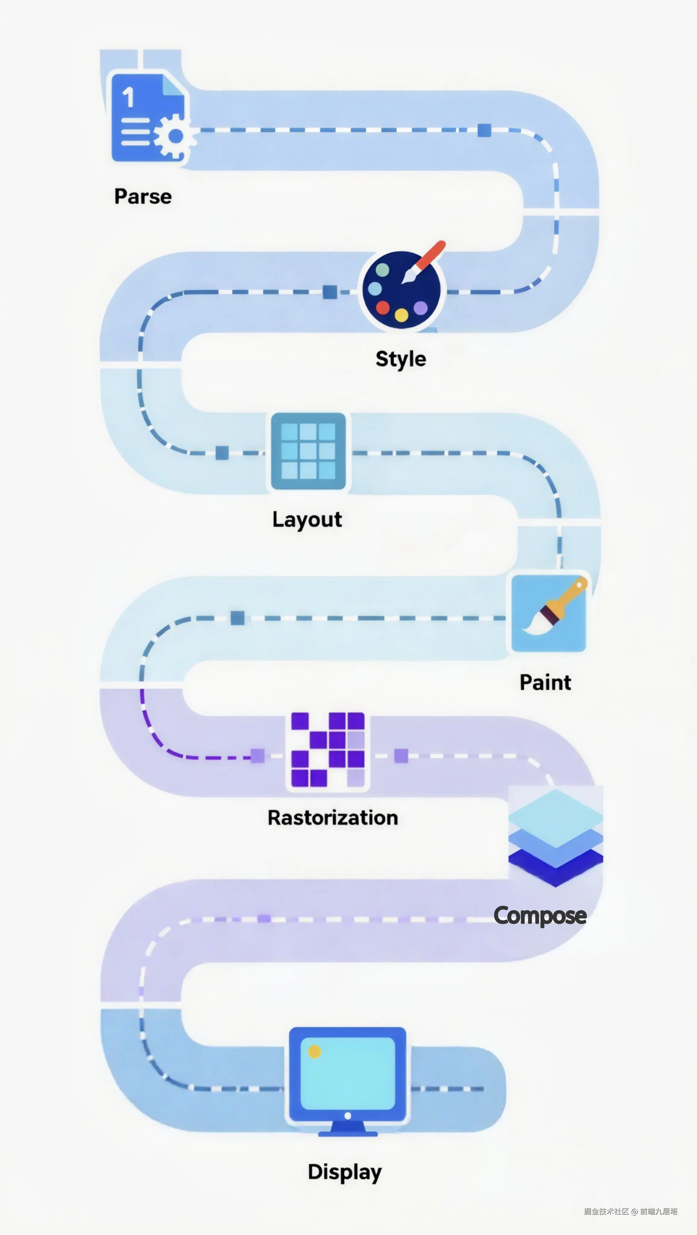 | Paint | Layout Tree | Display List | 生成绘制指令和分层决策 | 视觉样式变化 |
