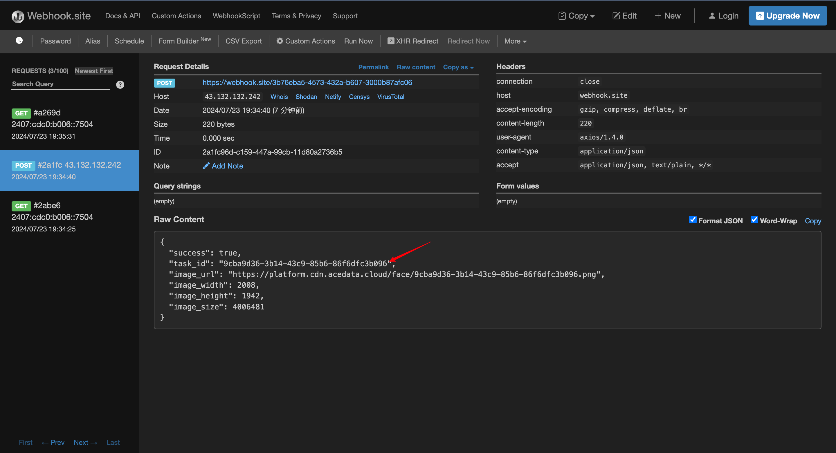 稍等片刻,我们可以在 webhook.site/3b76eba5-45… 上观察到生成 Face Swap 的结果,如图所示: