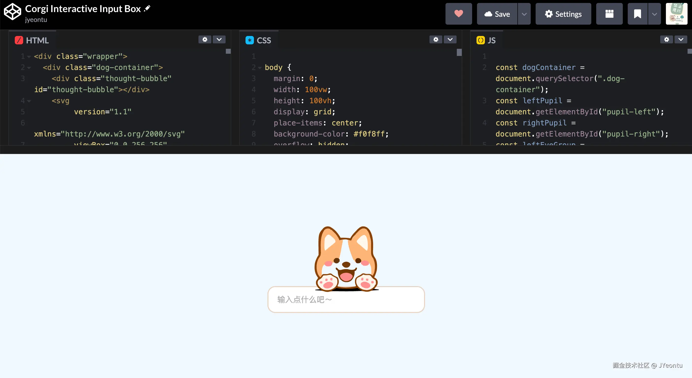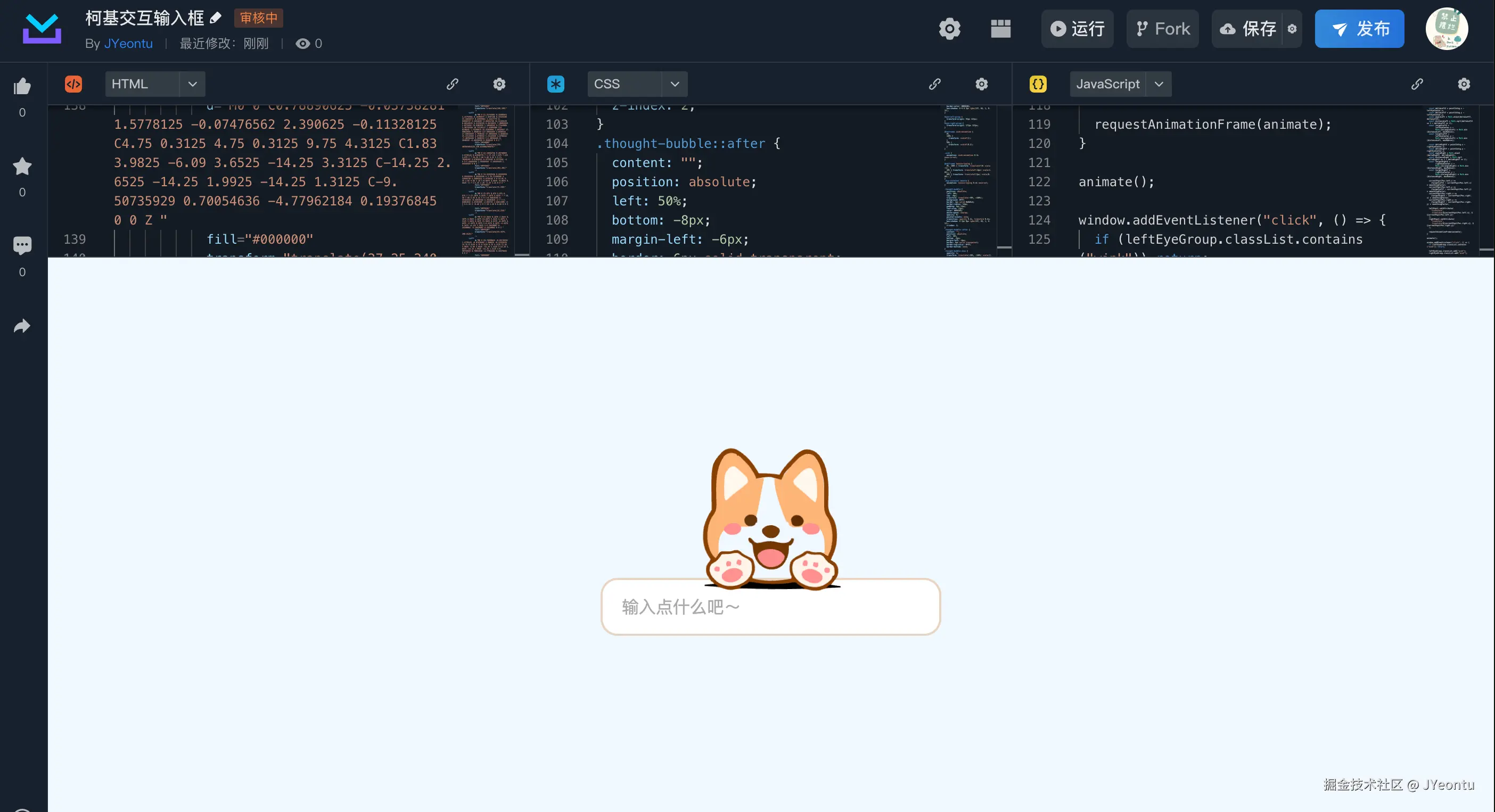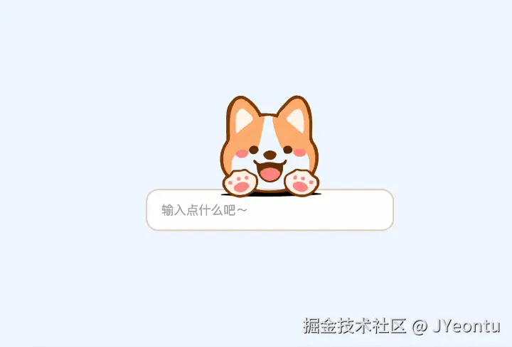 看腻了千篇一律的常规输入框,是时候给输入框加点趣味性了,今天我们来实现一个会和用户互动的柯基输入框:鼠标移动时柯基会扭头盯着你看,点击页面会眨眼,输入文字时还会弹动身体、弹出气泡反馈。