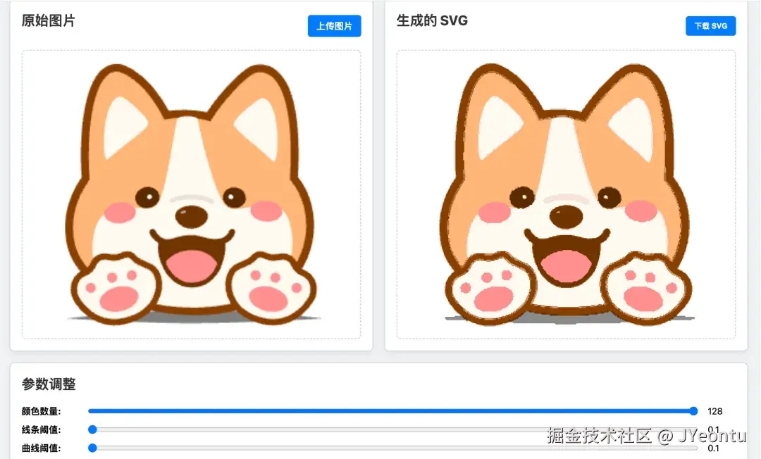 前面有一篇文章介绍了怎么将图片转为 SVG,这里可以直接在找一张柯基的图片来将其转为 SVG,转换工具地址如下: