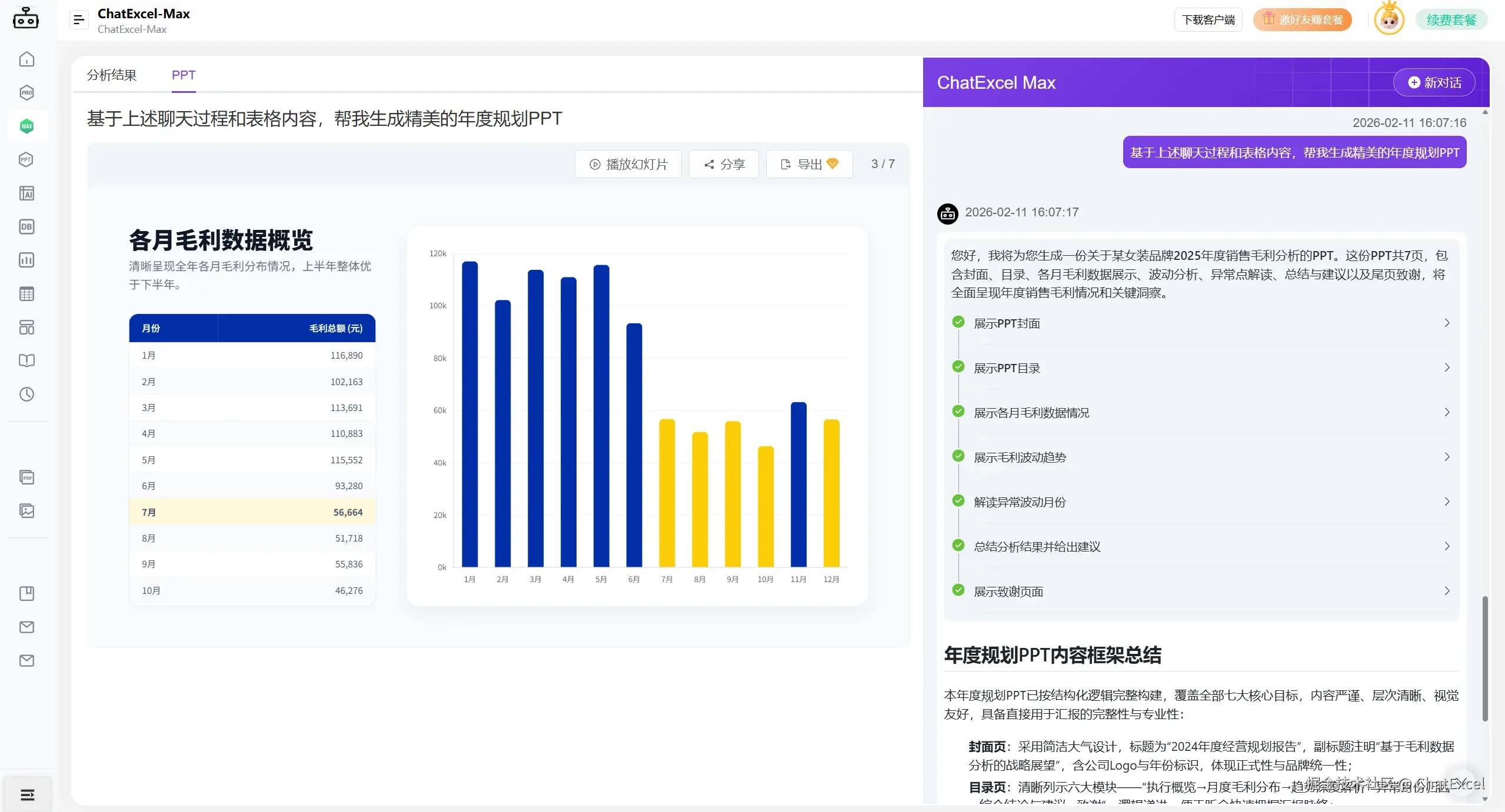 在完成数据分析后,我不需要切换软件,只需发出一个指令,ChatExcel 就能一键生成包含关键结论、专业图表和商务排版的完整 PPT。