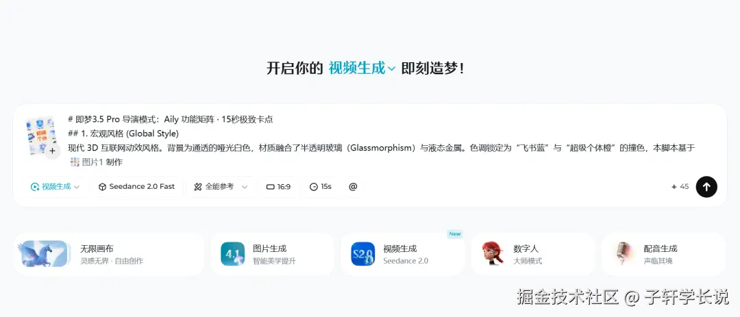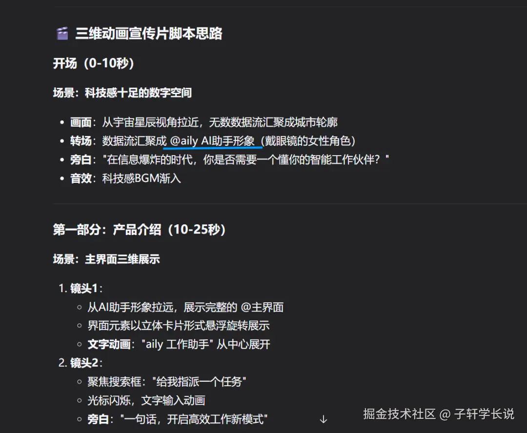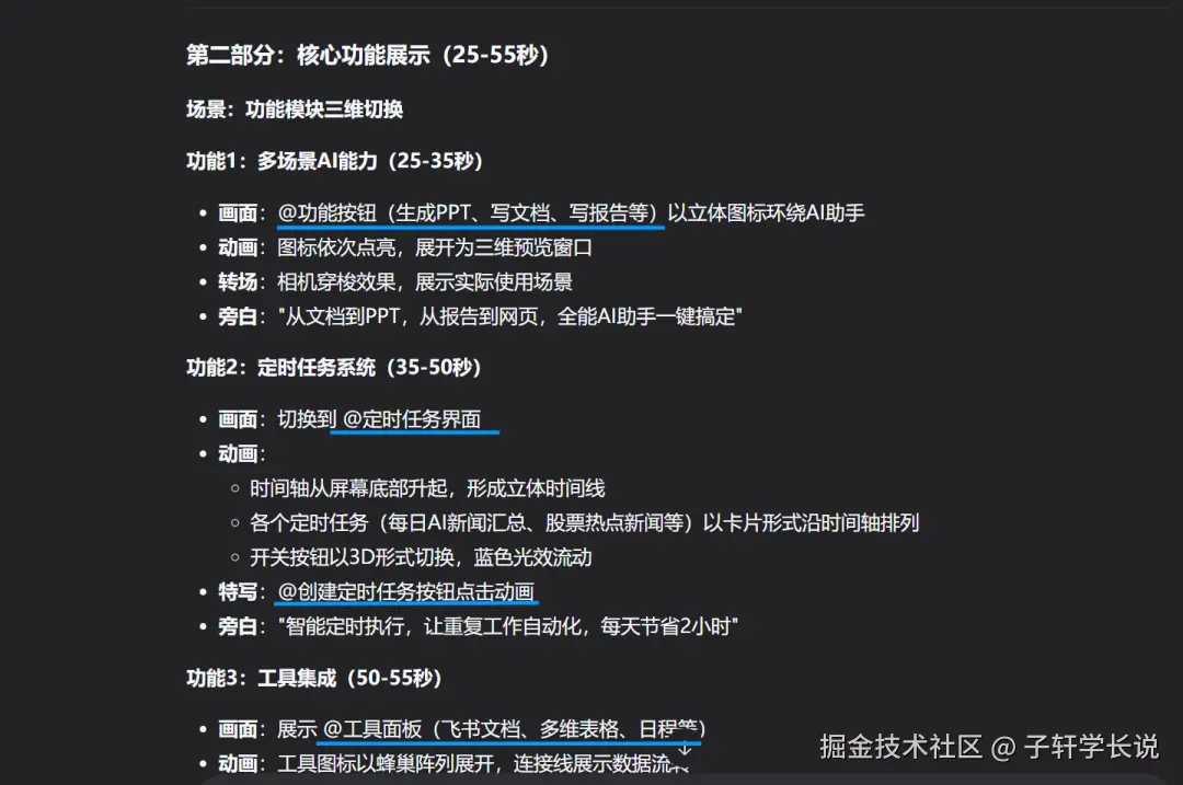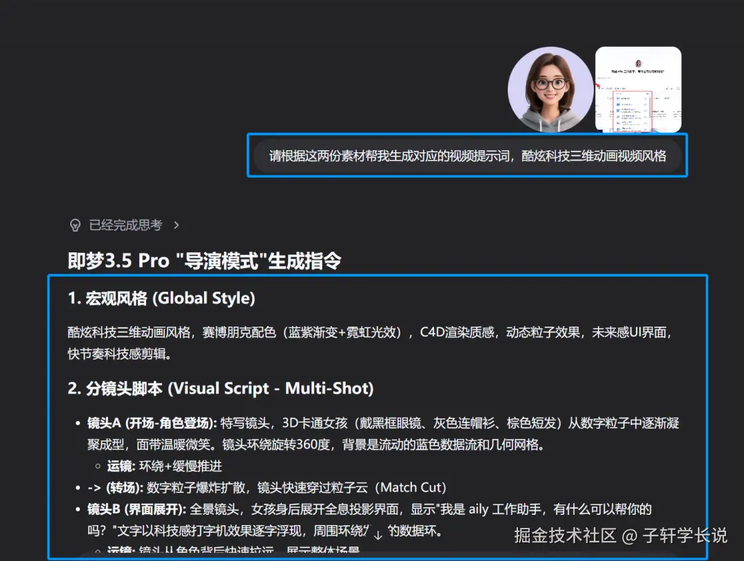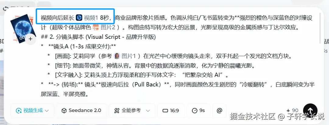 这套就是给ai的设定,让它扮演导演的角色帮你写脚本和视频提示词。比如我把飞书aily的LOGO和界面截图丢给AI后,输入:请根据这两份素材帮我生成对应的视频提示词。30秒就生成了三段式提示词,连"第8秒用环绕运镜展示功能模块"这种细节都写清楚了,比我花钱请的编导还专业。