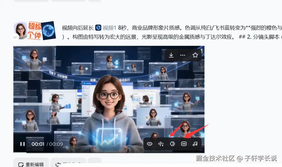 - 分段生成更可控:超过20秒的视频建议分3段生成,比如0-8秒LOGO动画、8-20秒功能展示、20-30秒结尾定格。每段生成后下载下来又可以作为下一段的参考素材参考,使用视频延长功能,在上一个视频结束的结尾继续生成新画面,这样衔接会更自然。