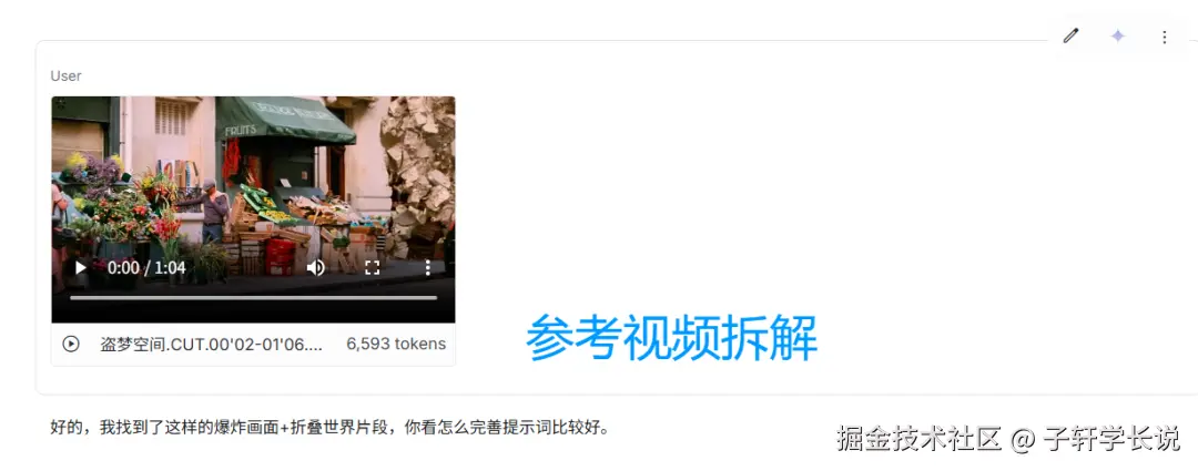 - 参考风格案例:如果有些特定酷炫的动效你想参考,那也可以单独找好对标的视频片段,同样丢给能识别视频的ai,AI会自动分析镜头语言,告诉你属于什么类型的动画,用了什么动效等。当然你也可以使用即梦seedance2.0的视频参考直接复刻也可以。