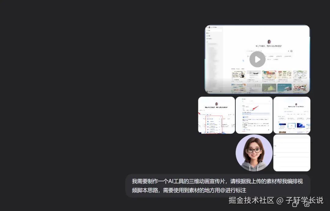 - 宣传逻辑线:哪怕写不出脚本也没关系,用大白话列要点就行。比如"先展示LOGO旋转,再切产品界面操作,最后出现官网信息"。如果思路都没有,那就干脆把所有素材丢给ai,让ai帮你分析编排就行,反正啥也能搞定,不过要找能识别视频的ai,国内可以用智谱或者qwen千问或者豆包都行。