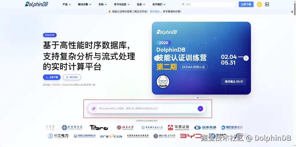 或直接输入官方网址(dolphindb.cn/think),一键进入 DolphinMind 官网首页。