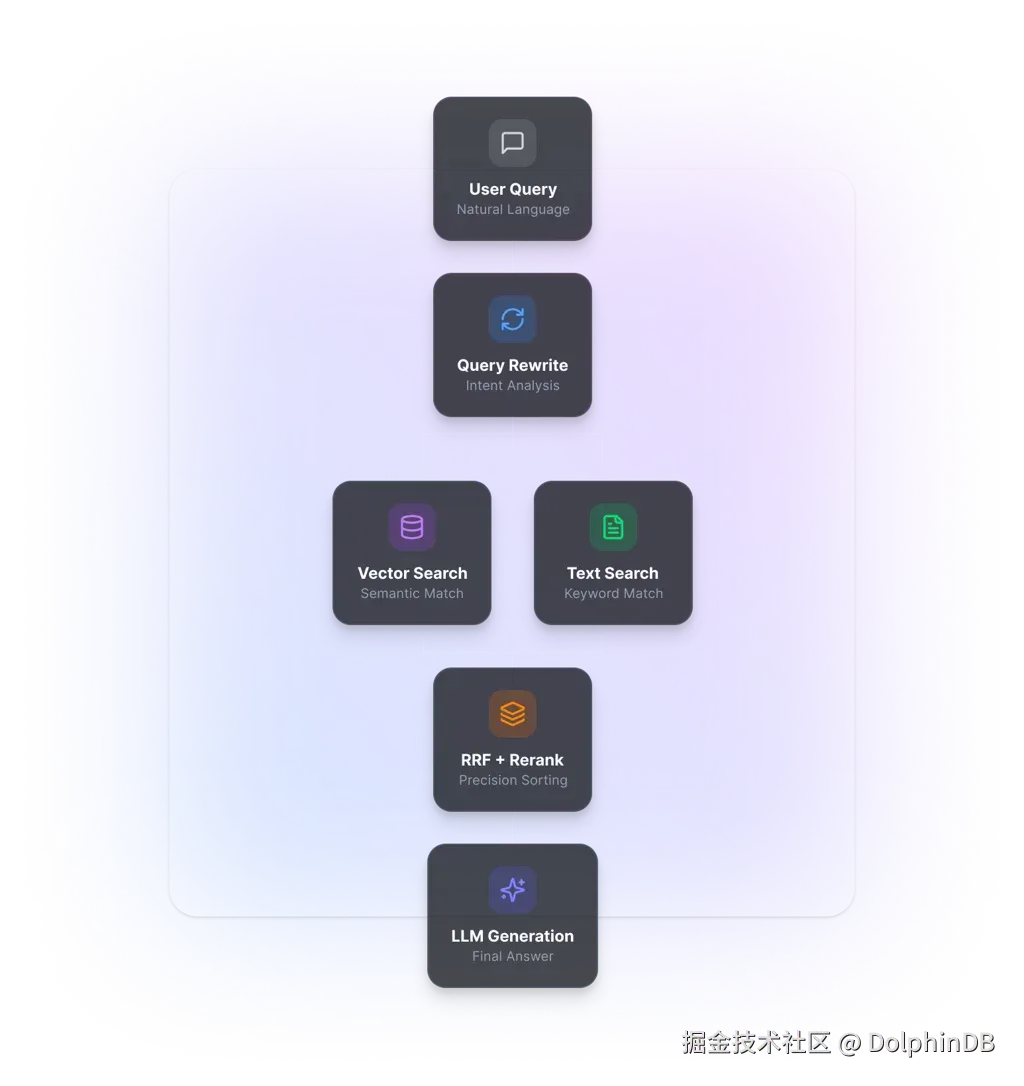 DolphinMind 是基于 DolphinDB 强大的向量引擎、文本引擎和计算能力构建的企业级 RAG 智能体,旨在解答日常使用 DolphinDB 与 DLang 过程中遇到的各类问题。其采用“混合检索 + 多路召回 + 重排序”架构,深度整合数据库与大模型能力,确保专业问答的极速响应与逻辑精准,消除大模型幻觉。