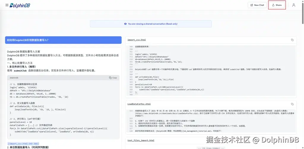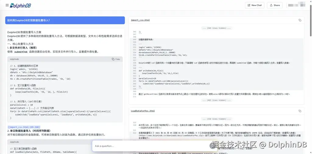 输入“如何用 DolphinDB 实现数据批量导入?”,分步指引+源文档,新手也能搞定。